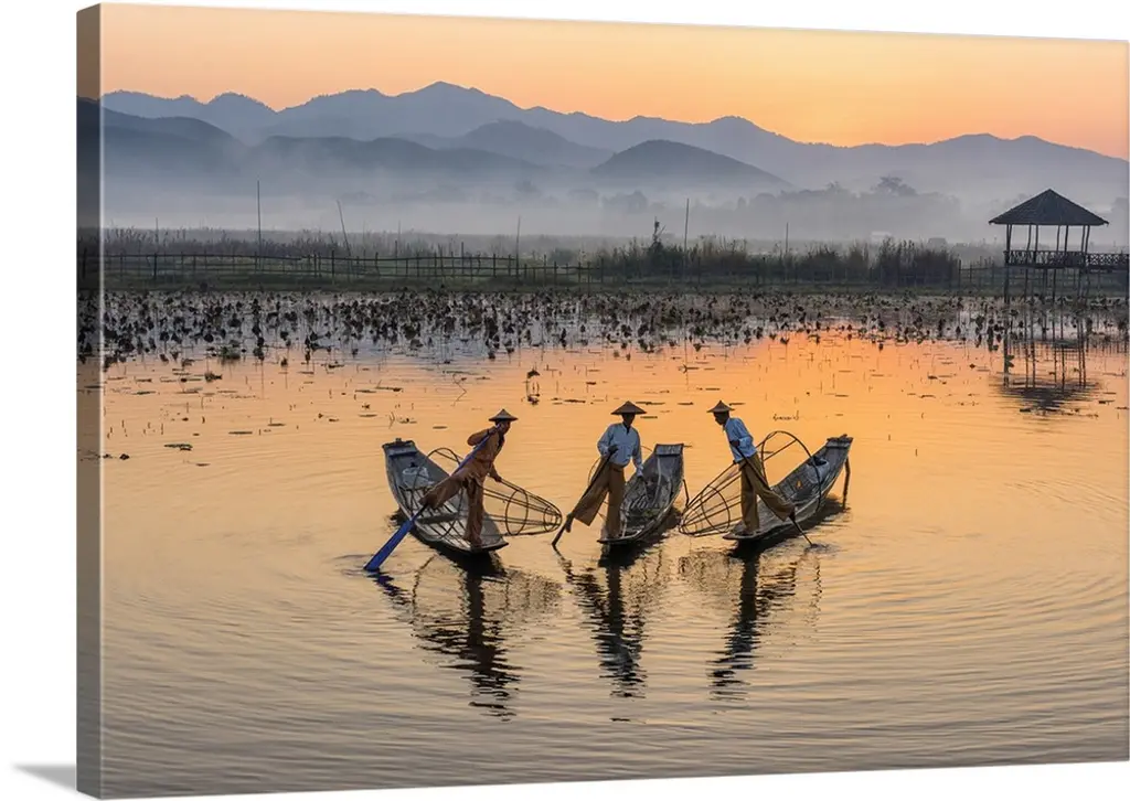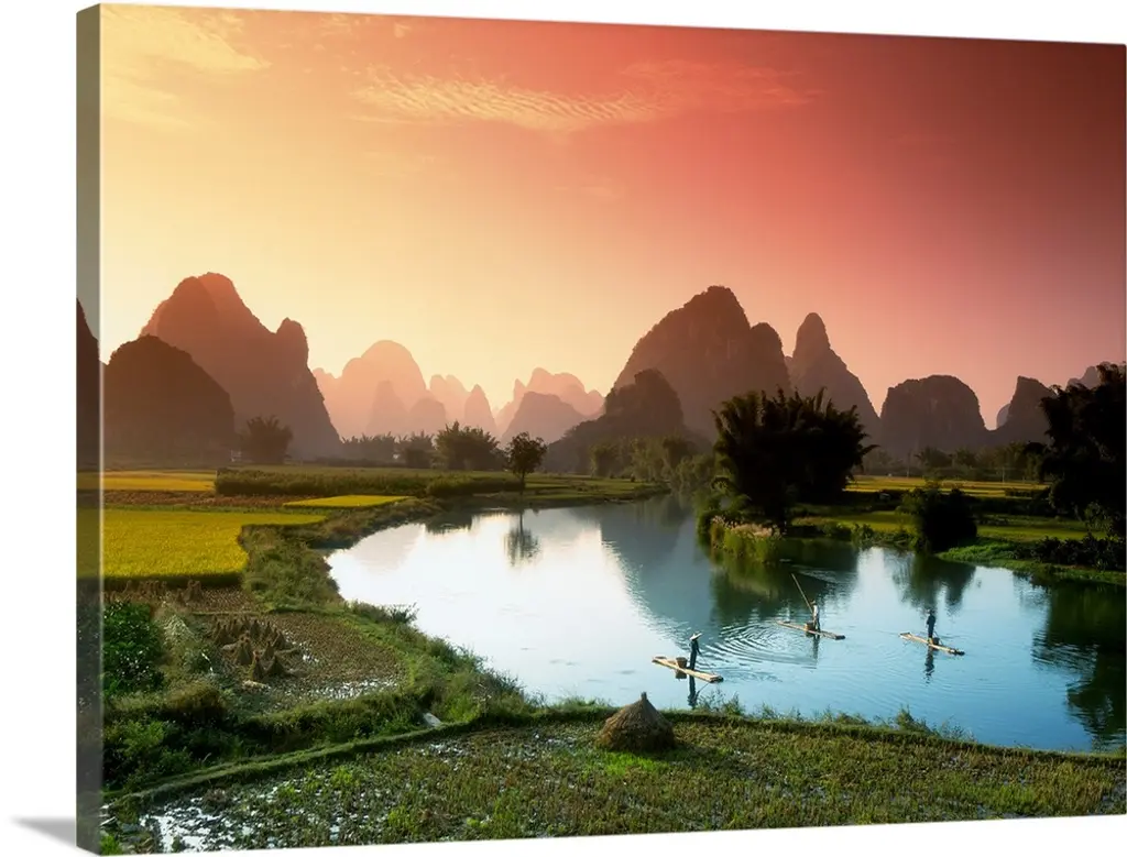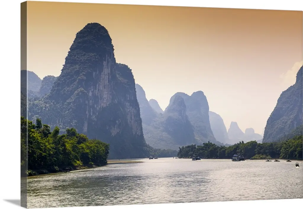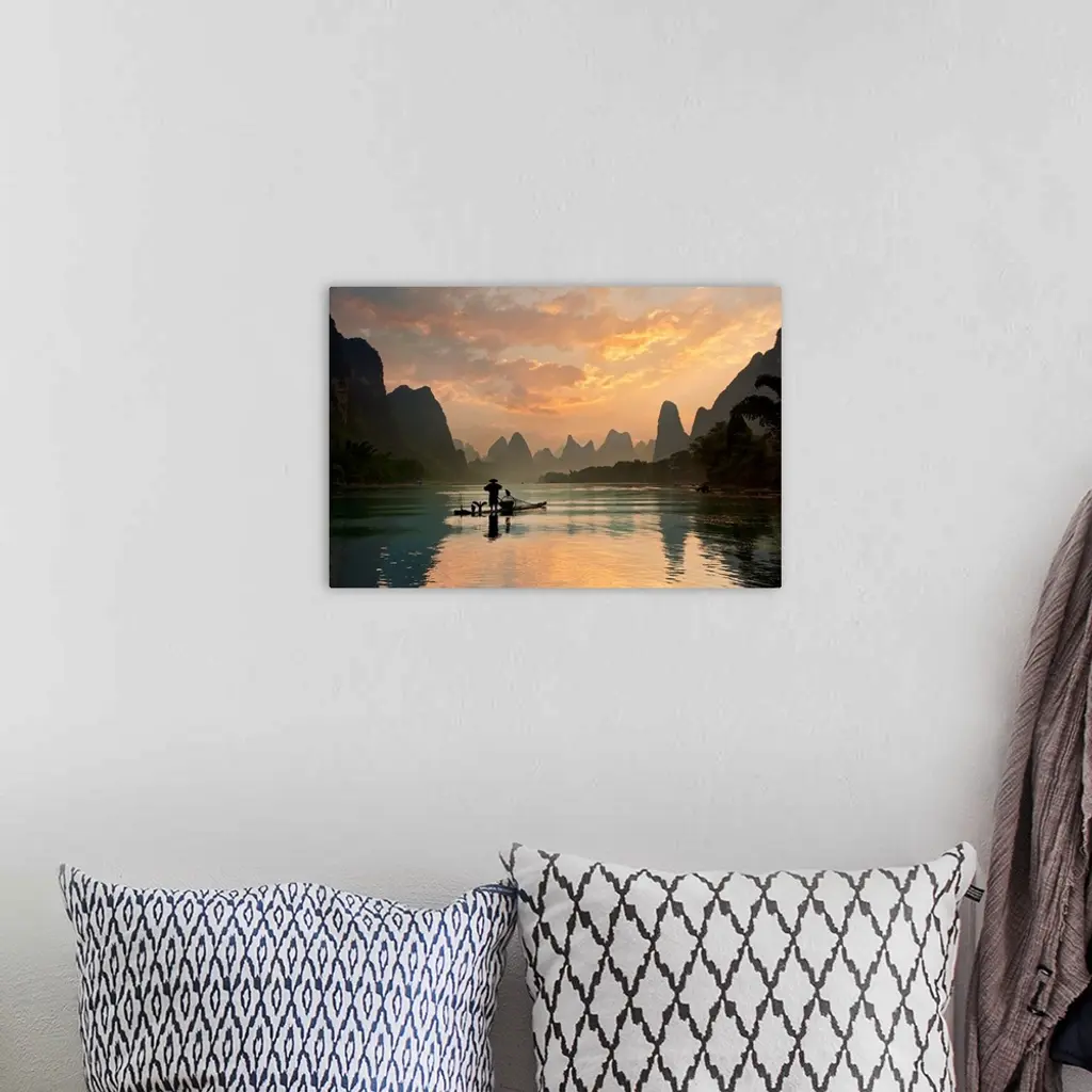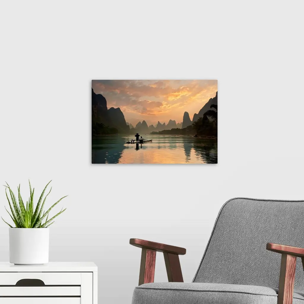 A fisherman and his cormorants on a boat in the Li River at dawn, China.