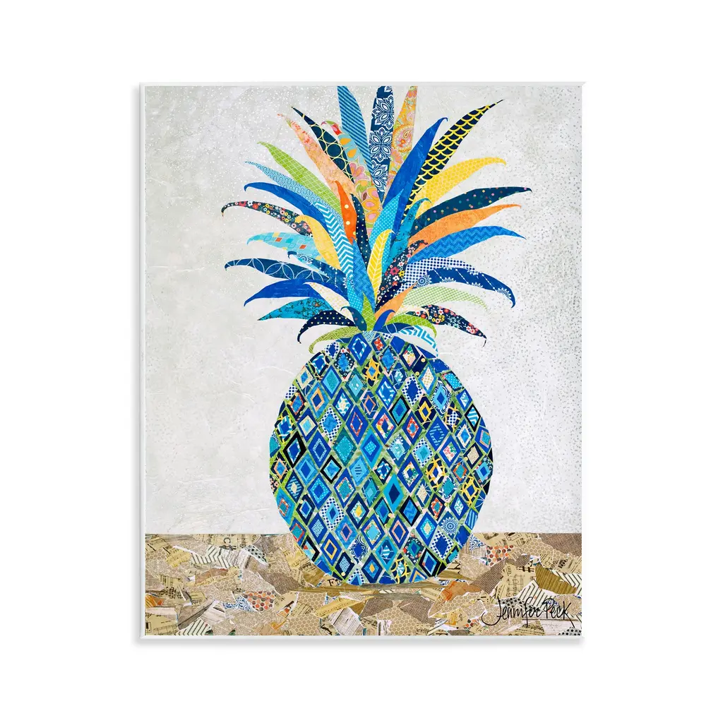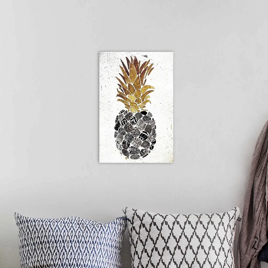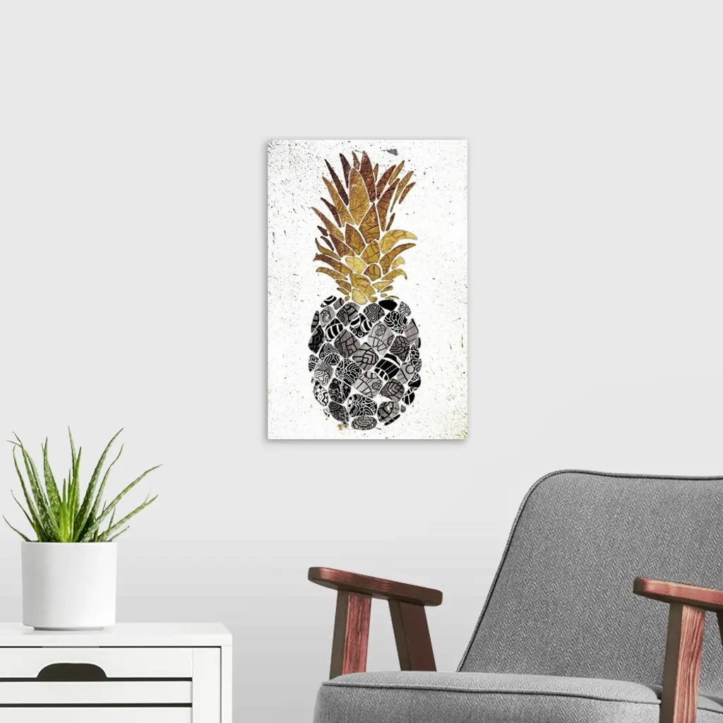 Pineapple with golden leaves an intricately designed patterns on its body.