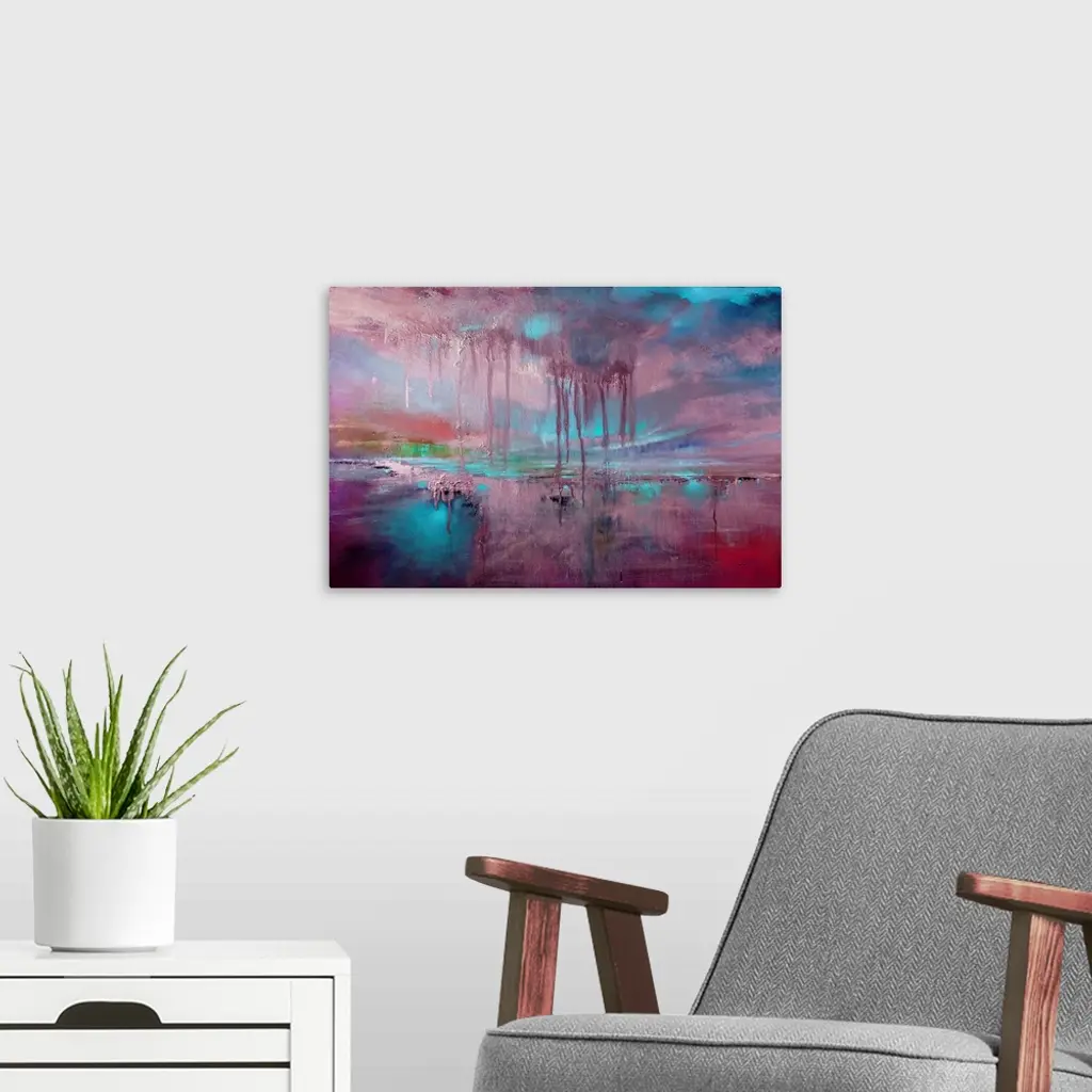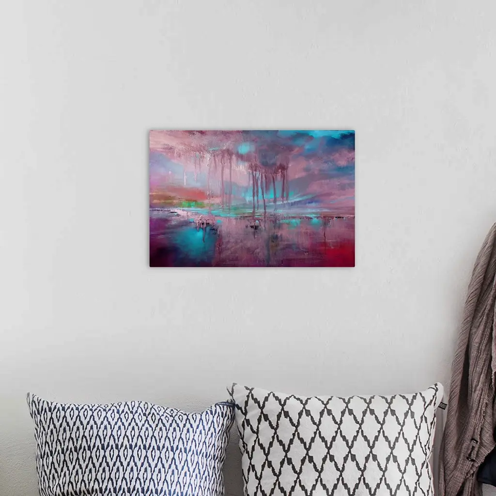 Abstract painted landscape with vivid structures. Wide horizon, clouds, bright light, intense blue, orange and red. Abstract painted rain of gold.