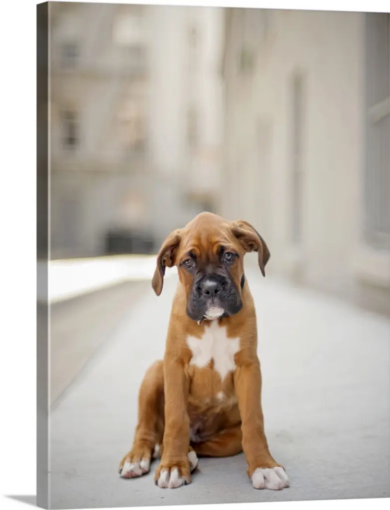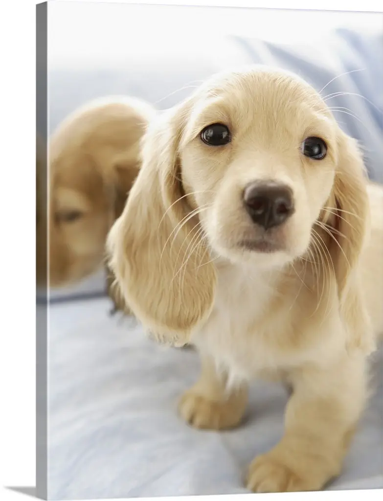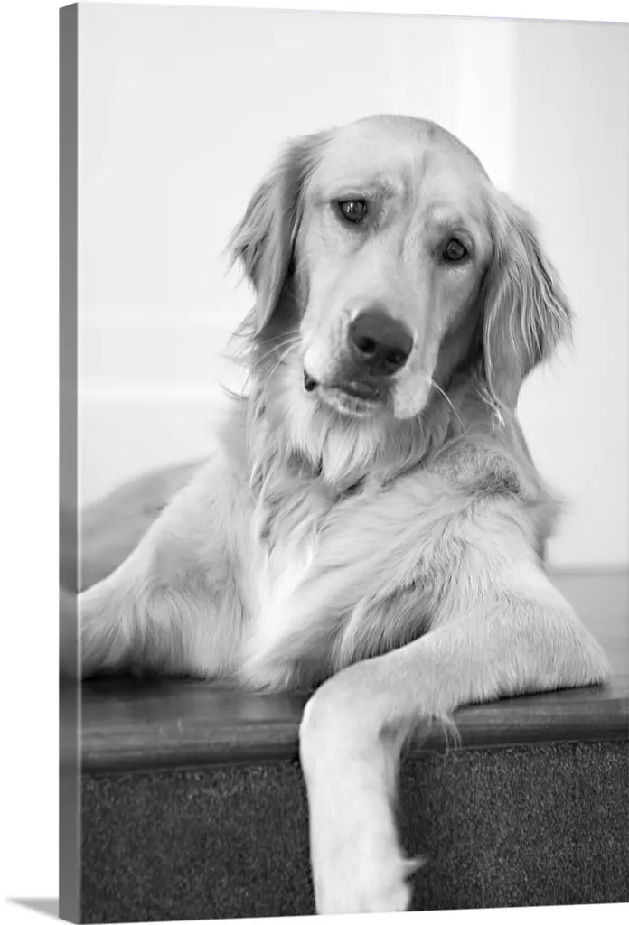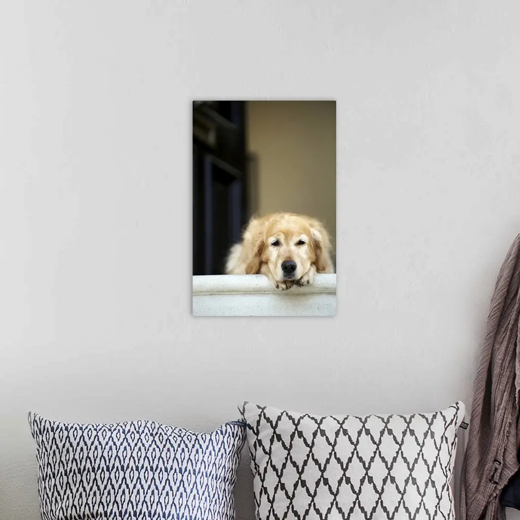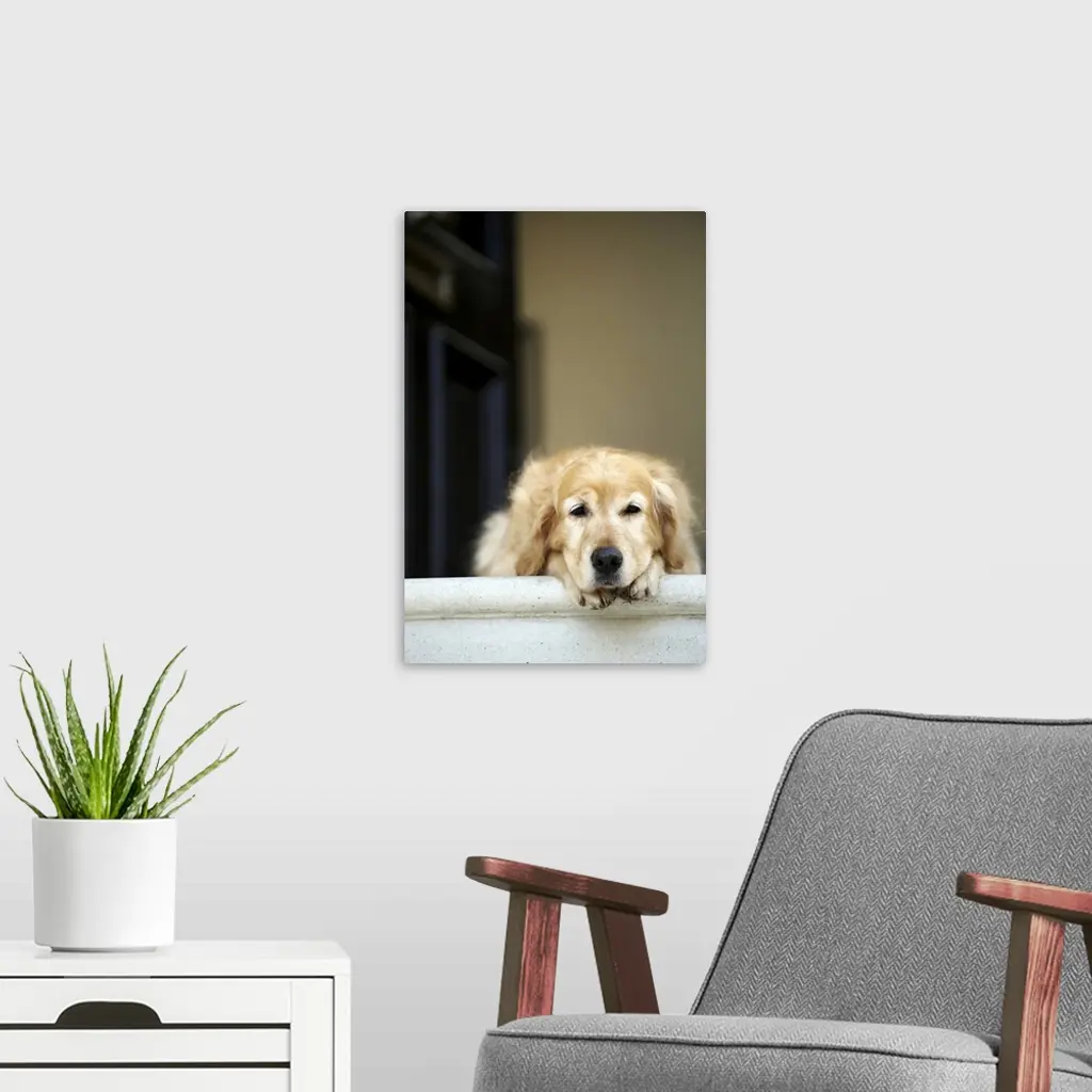 Golden retriever dog lying in front door of house, looking away (focus on foreground)