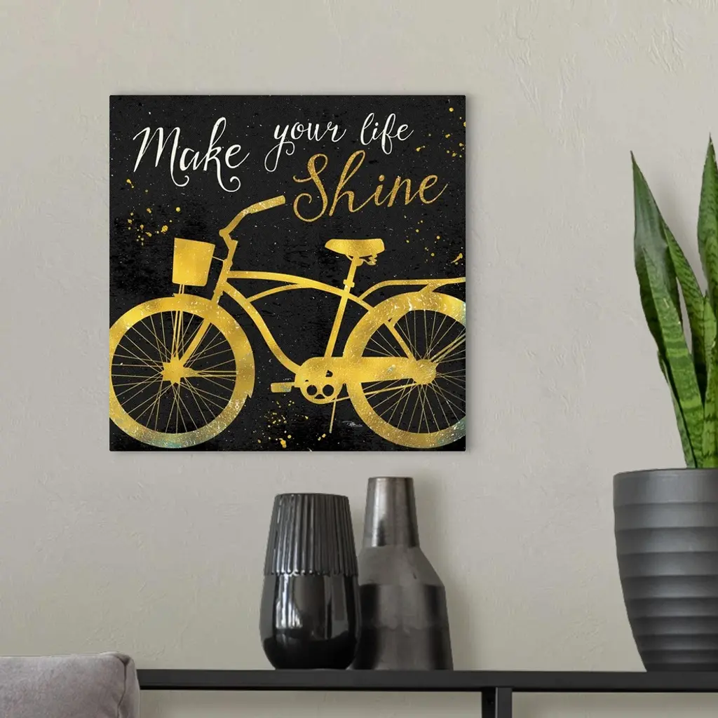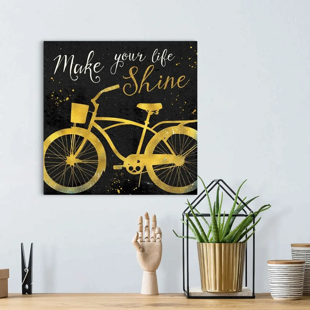 Silhouette of a bicycle in gold with "Make your life shine" above it.