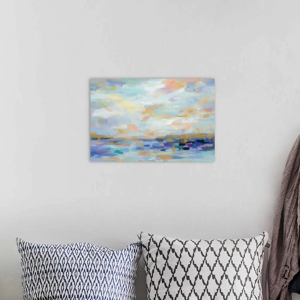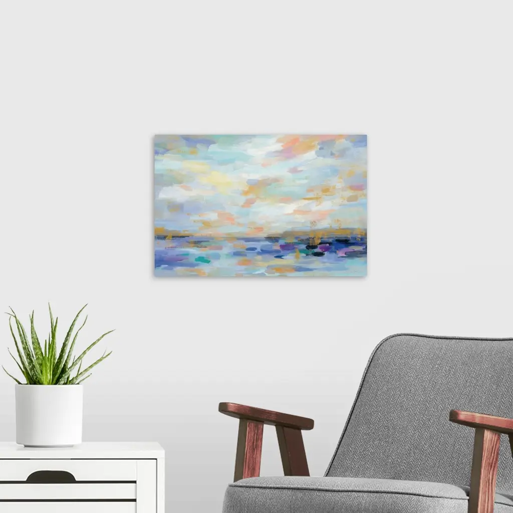 An abstract landscape of a sunrise seascape in varies warm colors.