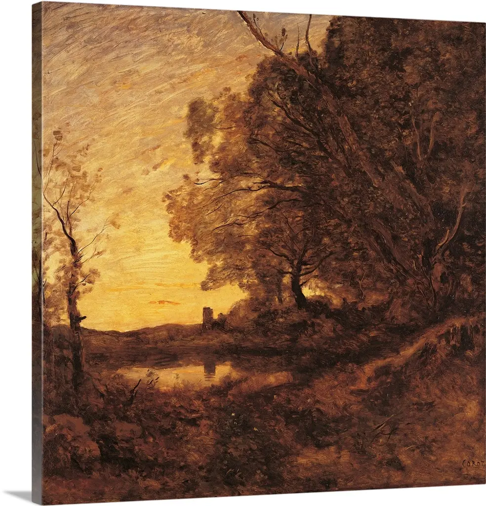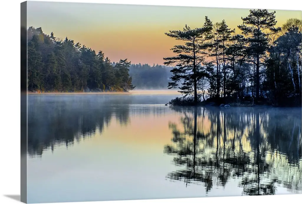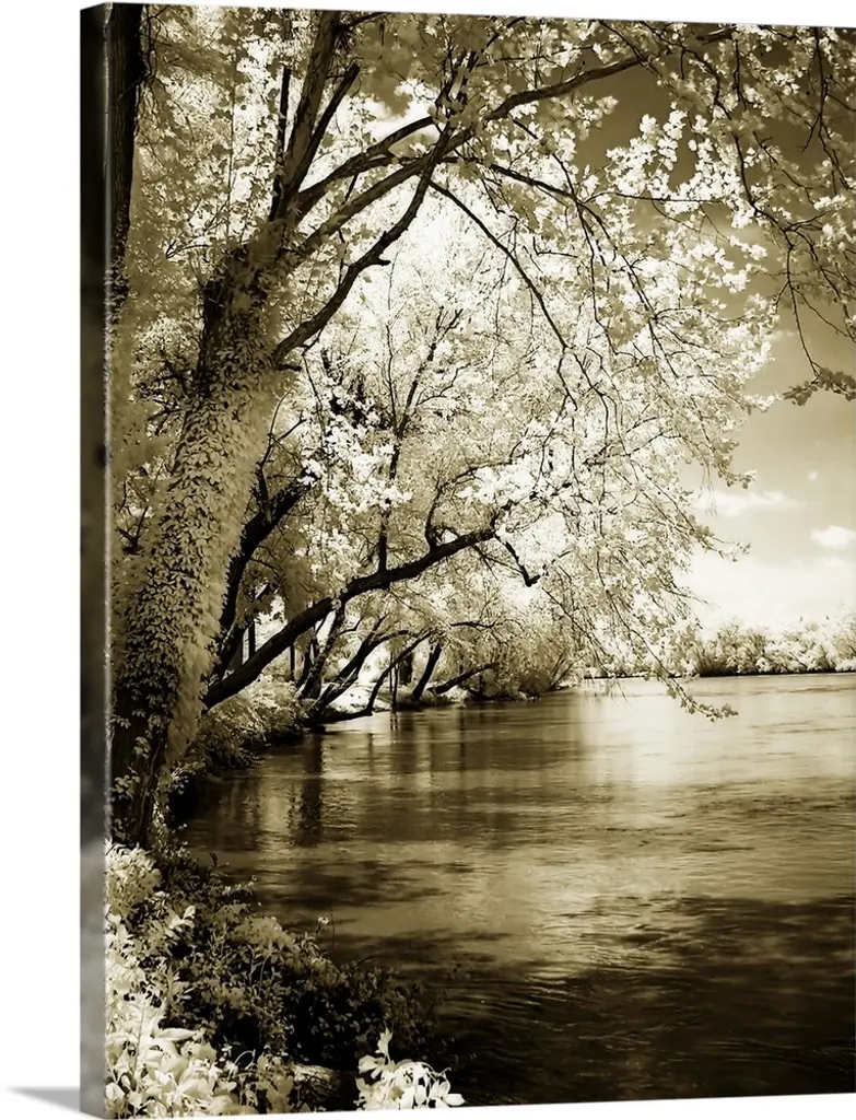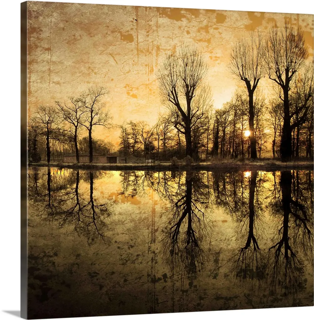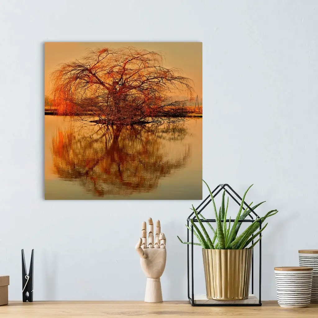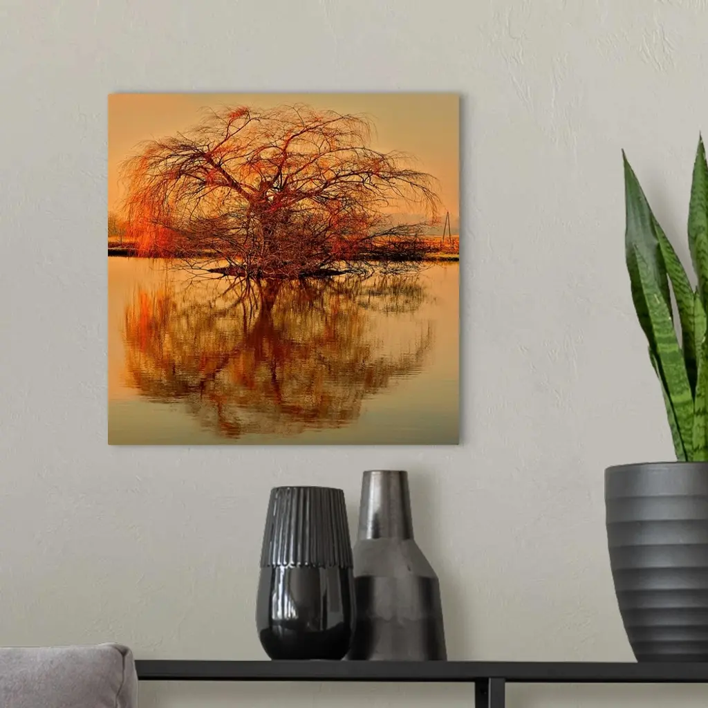 A weeping willow gross alone on a tiny island in the middle of a pond, its branches reflect in the surface of the water.