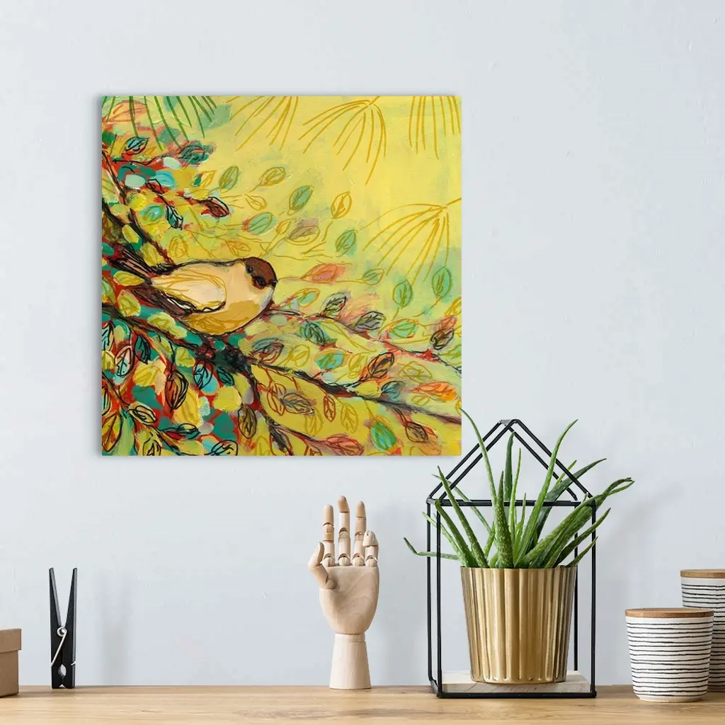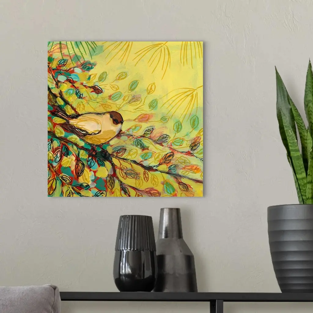 Large contemporary art displays a bird sitting on a tree branch during a sunny day. Artist heavily uses ovals and circles to depict the leaves on the tree.