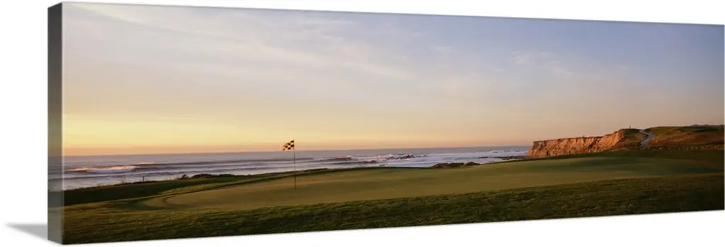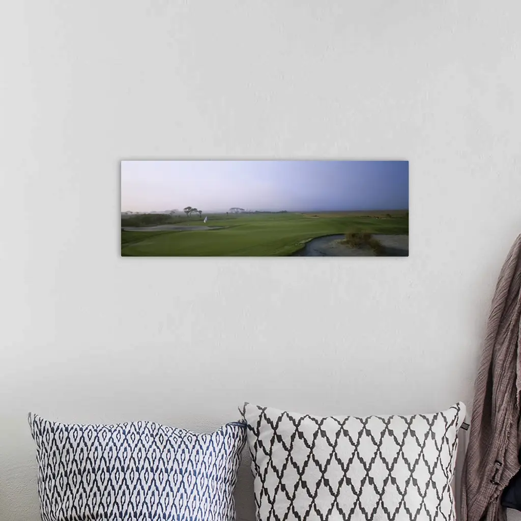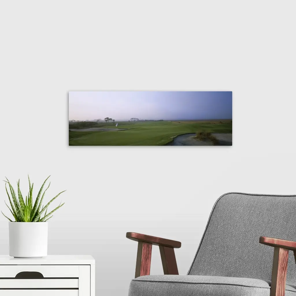 Giant landscape photograph of a flag surrounded by the rolling greens on Ocean Golf Course, beneath a hazy blue sky on Kiawah Island, South Carolina.