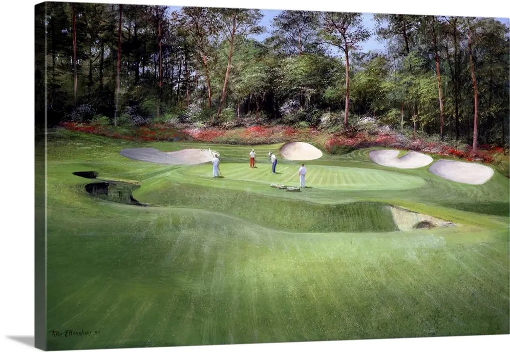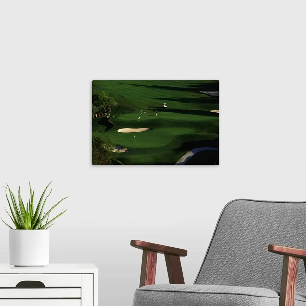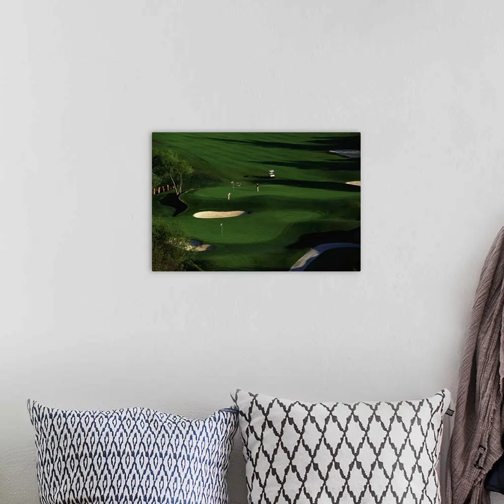 This decorative wall art is an aerial photograph of a California golf course in a landscape scene.
