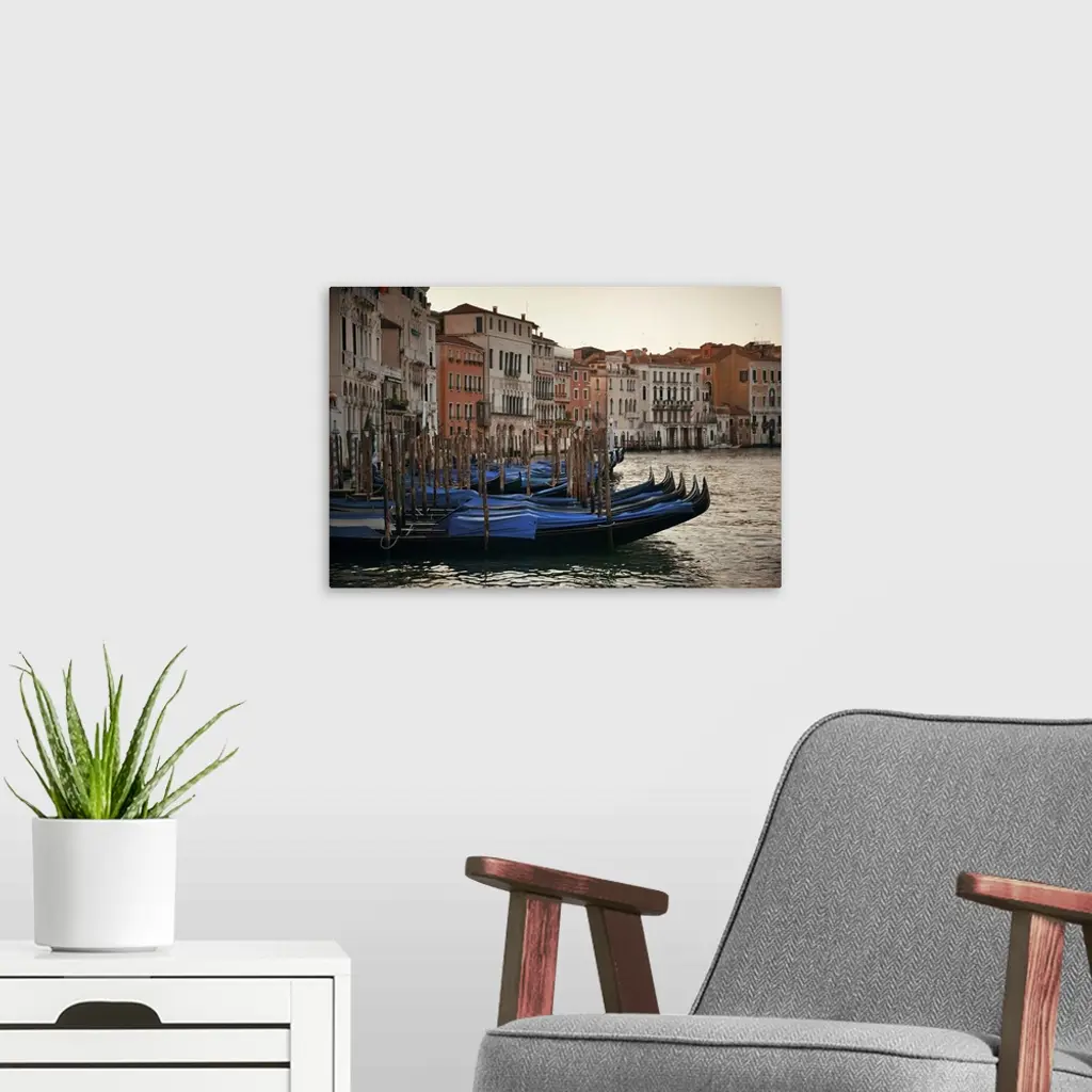Gondola Park In Water In Venice Canal With Historical Buildings, Italy