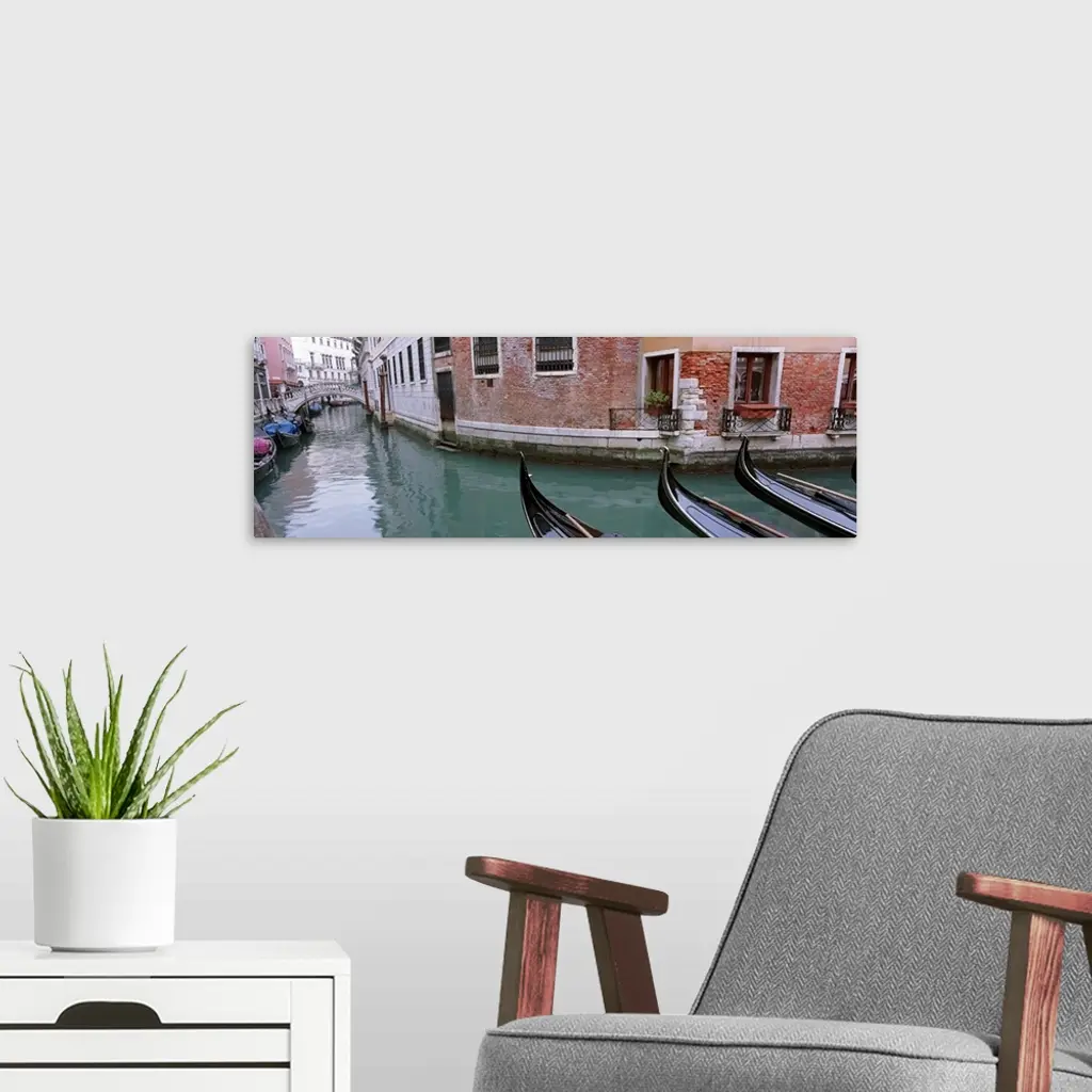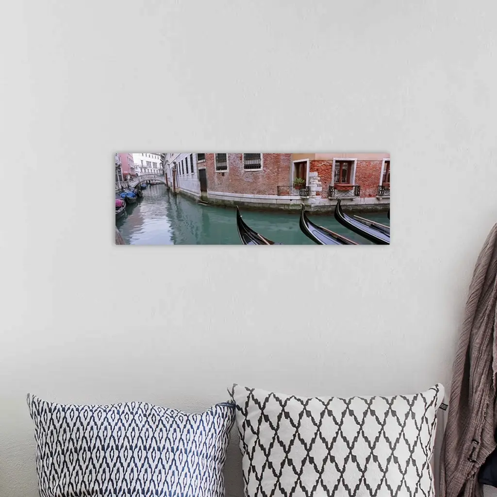 The front of gondola boats are pictured in the water with buildings to either side of the canal where more boats are shown.