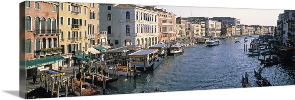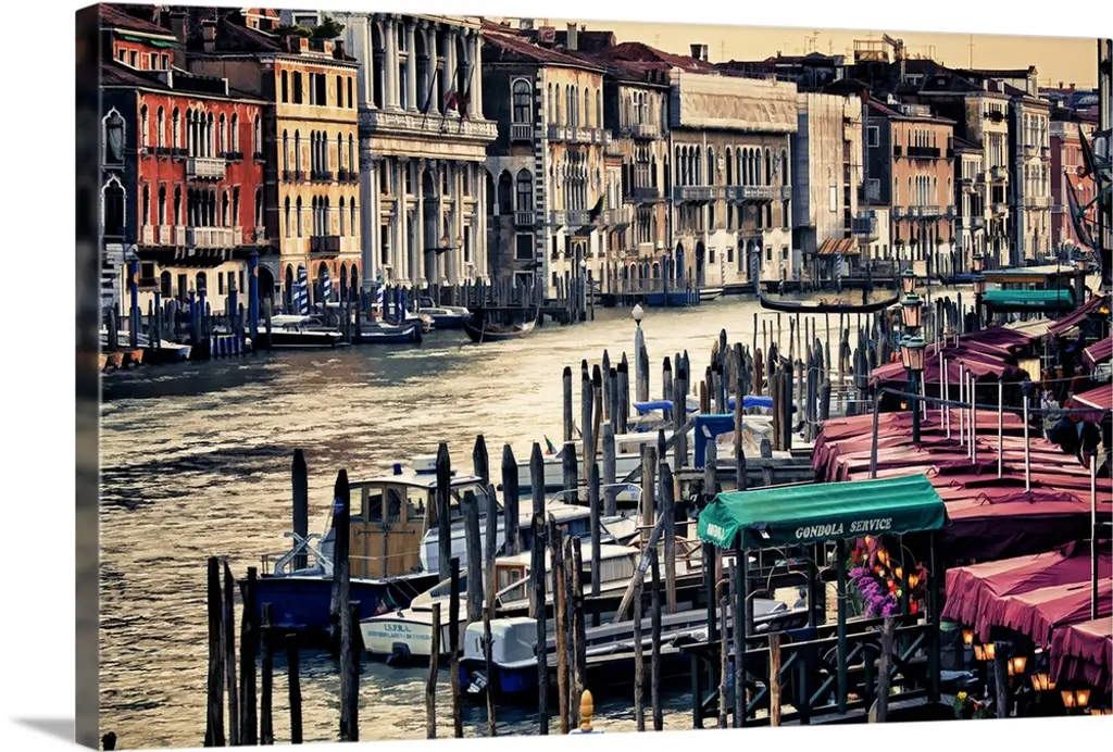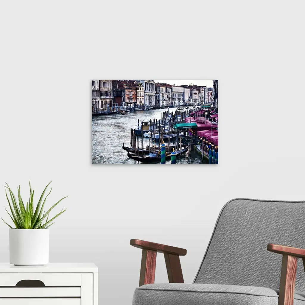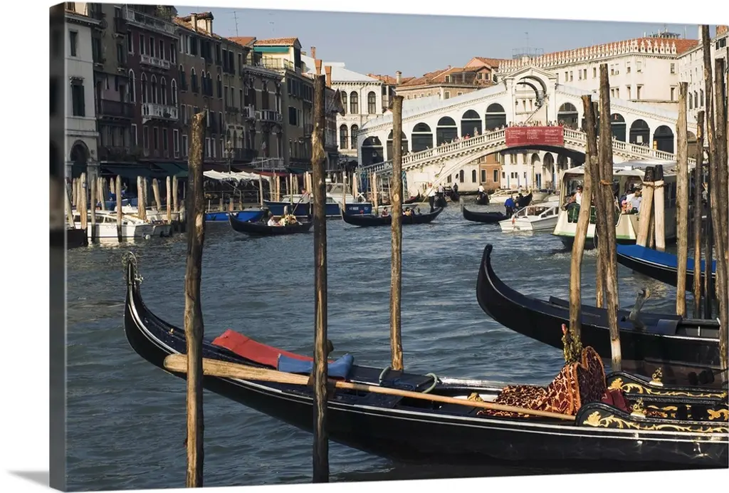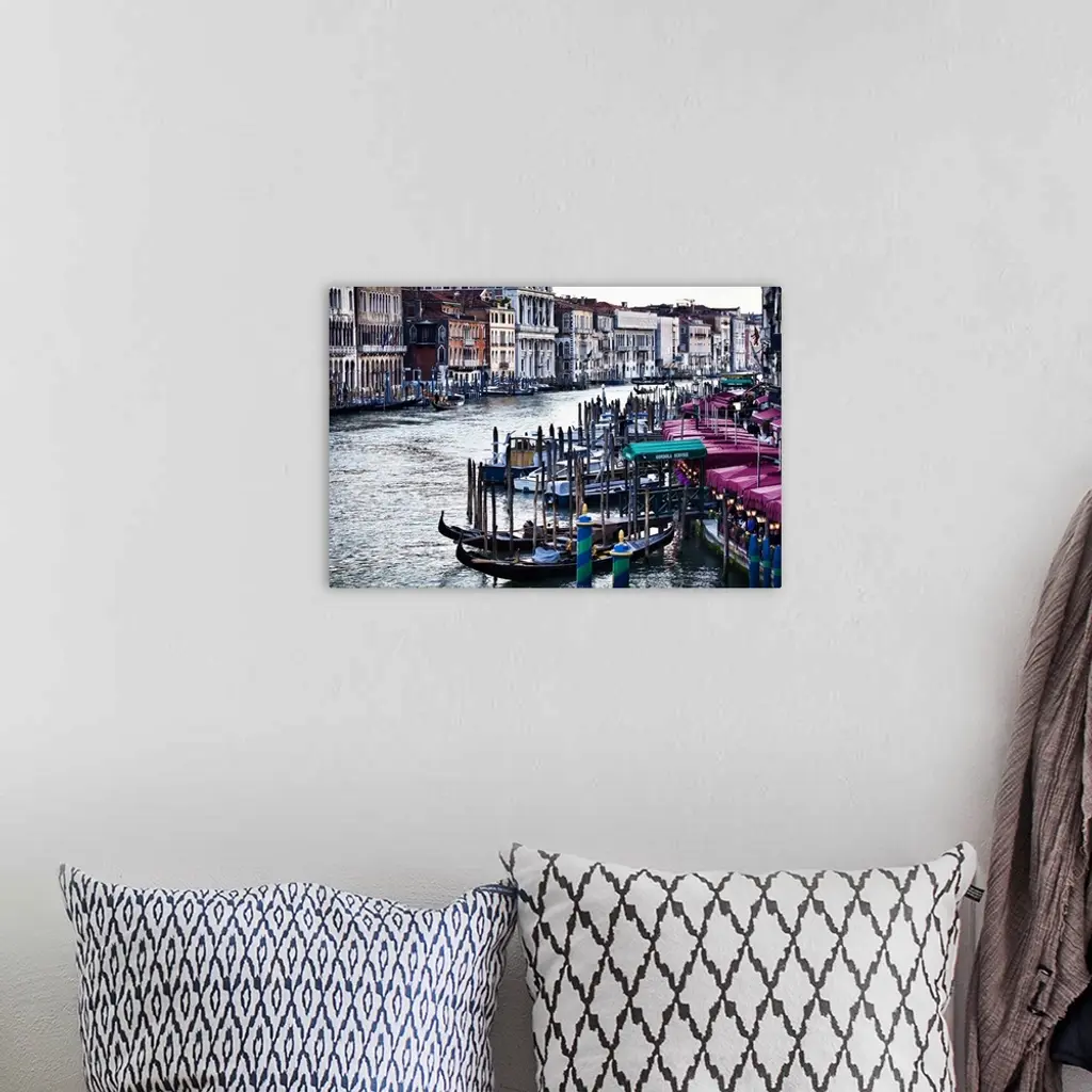 Gondola boats sit in the water which curves toward the back of the picture and is lined on either side by buildings and docks.