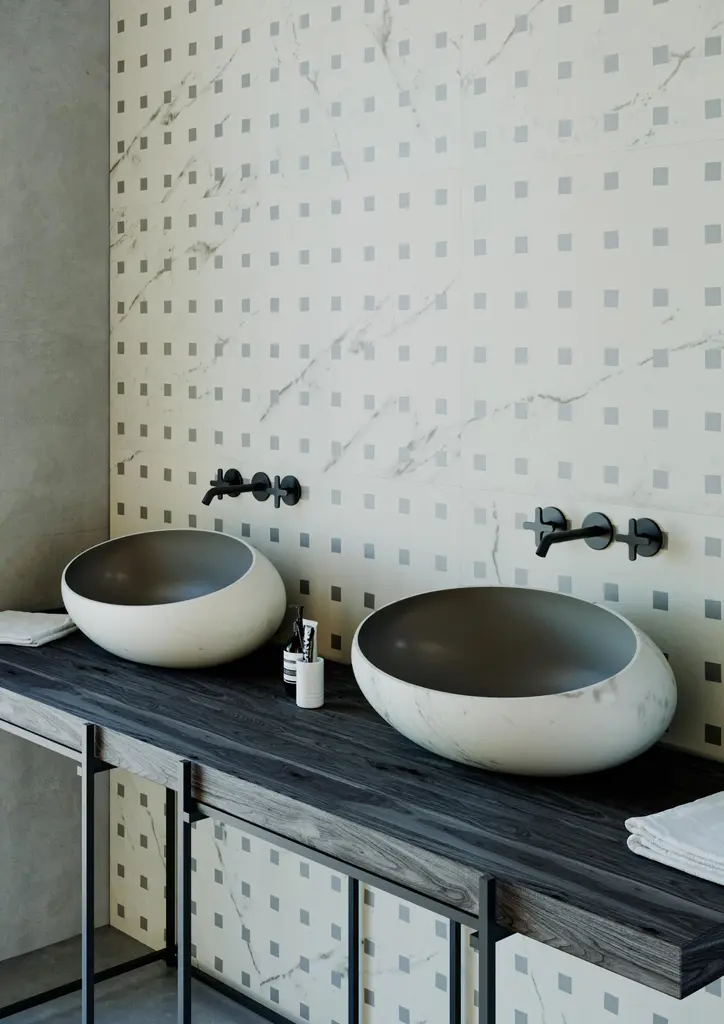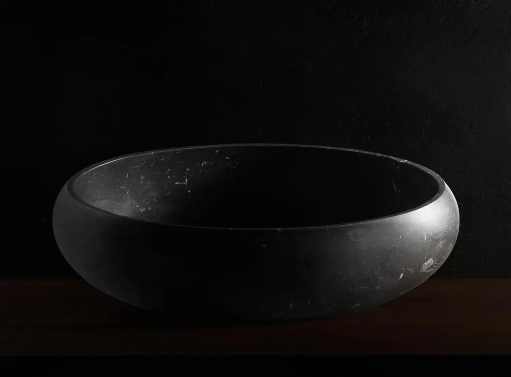 Gong Countertop Large Basin by Kreoo Designed by Christophe PilletDimensions: D 50 x W 80 x H 33 cm.Materials: Nero Marquina marble.Weight: 60 kg.Available in different marble and travertine options. Available in two different sizes. Please contact us.The softness of pebbles worked by the action of water inspires the aesthetics of the Gong collection, which includes freestanding and countertop washbasins where marble fully expresses its value and natural background.The ellipsoidal shape of the bowl, in two sizes for both versions, emphasizes the nuances of the material, which can be chosen from the ten proposals in the catalogue, while the diagonal cut of the volume gives it a unique and distinctive design.The result is an oval carved out with a meticulous and extremely fine technique, whose internal surface can also be realized in contrasting colours, with a materic and precious coating in different colours.Kreoo: the new marble experienceKreoo links its name to the best Italian tradition in marble manufacturing and brings to new light the primordial charm of a material that has witnessed the evolution of civilizations and cultures.From the bathroom and living room to coverings, home accessories, and lamps, the company works with natural stone in various forms and aesthetic compositions, enriching it with other materials such as metals, wood, and glass. The result is a fascinating and chromatic language, suitable both indoors and outdoors. Expressed in contemporary but still customizable designs, Kreoo highlights workmanship know-how and excellence.The brand, born in 2010 by the experience of Decormarmi and its worldwide distribution strength, has led to major international projects, especially in hospitality and luxury residential.