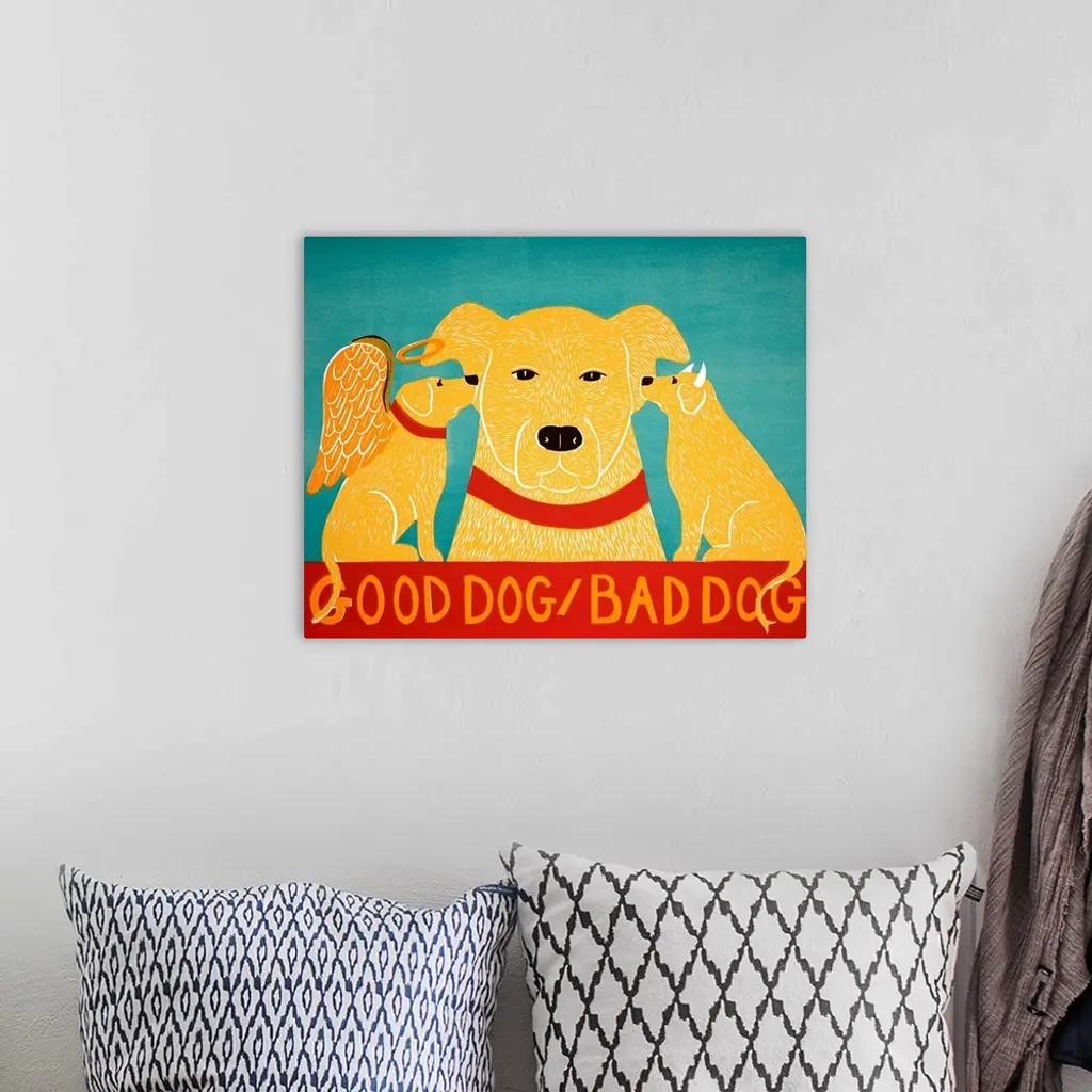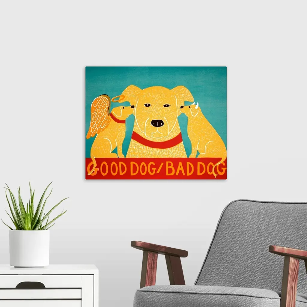 Illustration of a yellow lab with an angel and devil yellow lab on each shoulder whispering in its ear and the phrase "Good Dog/Bad Dog" written at the bottom.