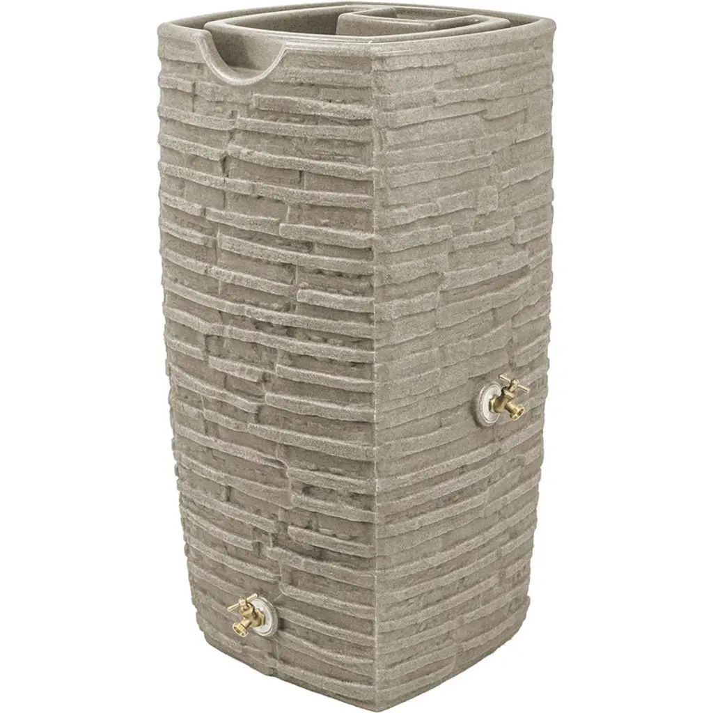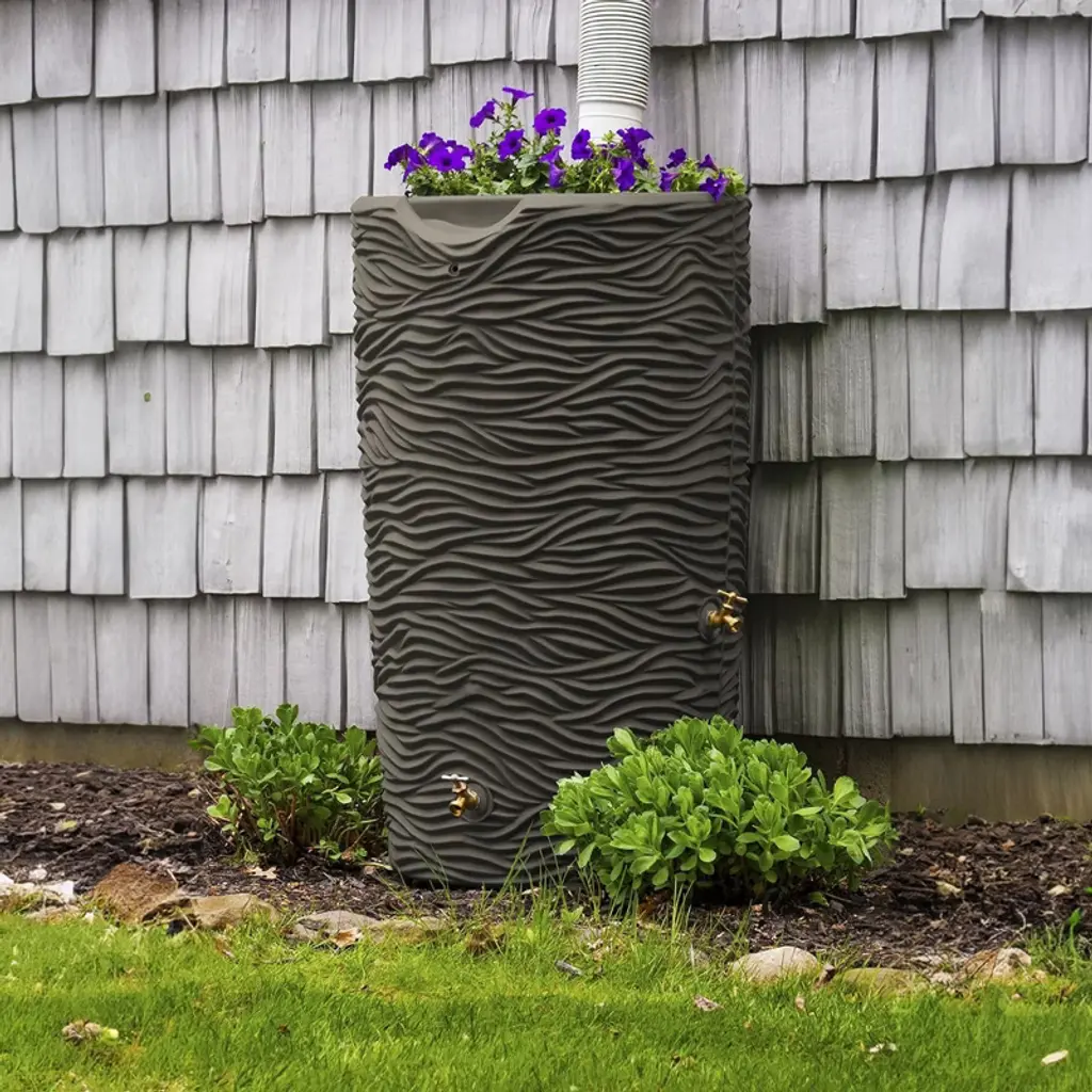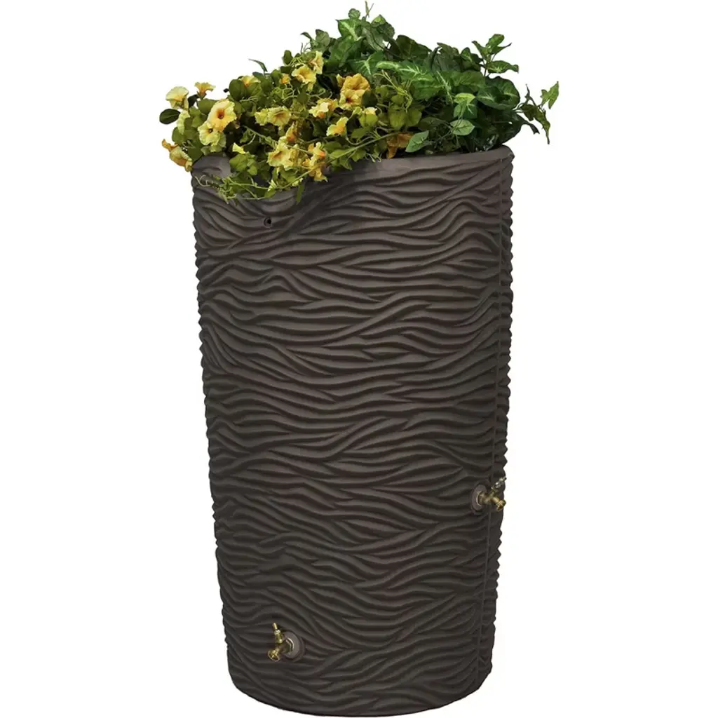 Imagine a rain barrel that not only captures the pure essence of Mother Nature but also advances the art of rain harvesting to a whole new level. With this Impressions 65-gallon Palm Rain Saver from Good Ideas, this rain barrel isn't just functional, it's a masterpiece of sustainability. Boasting an exclusive palm trunk texture, the plastic container garners compliments from your neighbors as well as adding a touch of natural beauty to your outdoor space, turning your garden into a work of art. But this rain barrel isn't just about looks, it's also a remarkable example of high functionality. A meticulously meshed screen stands guard, blocking debris from entering your water supply, ensuring that every drop collected is as pure as the day it fell from the sky. Built to last, its 2 robust metal spigots remain immune to rust or breakage, guaranteeing a dependable and enduring rainwater dispensing solution. This rain barrel comes equipped with a routed channel that ingeniously diverts excess water to the front of the barrel, making sure your home's foundation stays dry while your garden thrives. One of the biggest challenges with most rain barrels is that the spigot sits too high, leaving a significant amount of water trapped below it—wasted and potentially stagnant. Meanwhile, barrels with low spigots offer no room to fit a bucket underneath. The Rain Wizard Universal Stand eliminates both problems by raising your barrel off the ground, allowing easy access to the spigot while ensuring more complete water drainage. This stand fits nearly all Good Ideas rain barrels with round bases ranging from 19 to 26 inches (excluding Riverwalk, Savannah, and Amphora series). The flat-back design minimizes the footprint against walls, fences, or sheds—perfect for tight spaces. Upgrade your rainwater system today with the Good Ideas Impressions 65 Gallon Palm Trunk Rain Saver and Rain Wizard Universal Stand—smart, sturdy, and stylish support for your sustainability efforts.