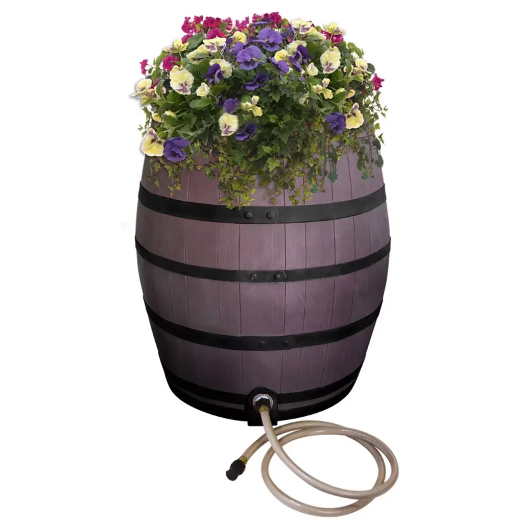 Good Ideas Impressions 65 Gallon Palm Trunk Rain Saver With 2 Spigots And Rain Wizard Rain Barrel Stand To Add Room For Buckets, Oak