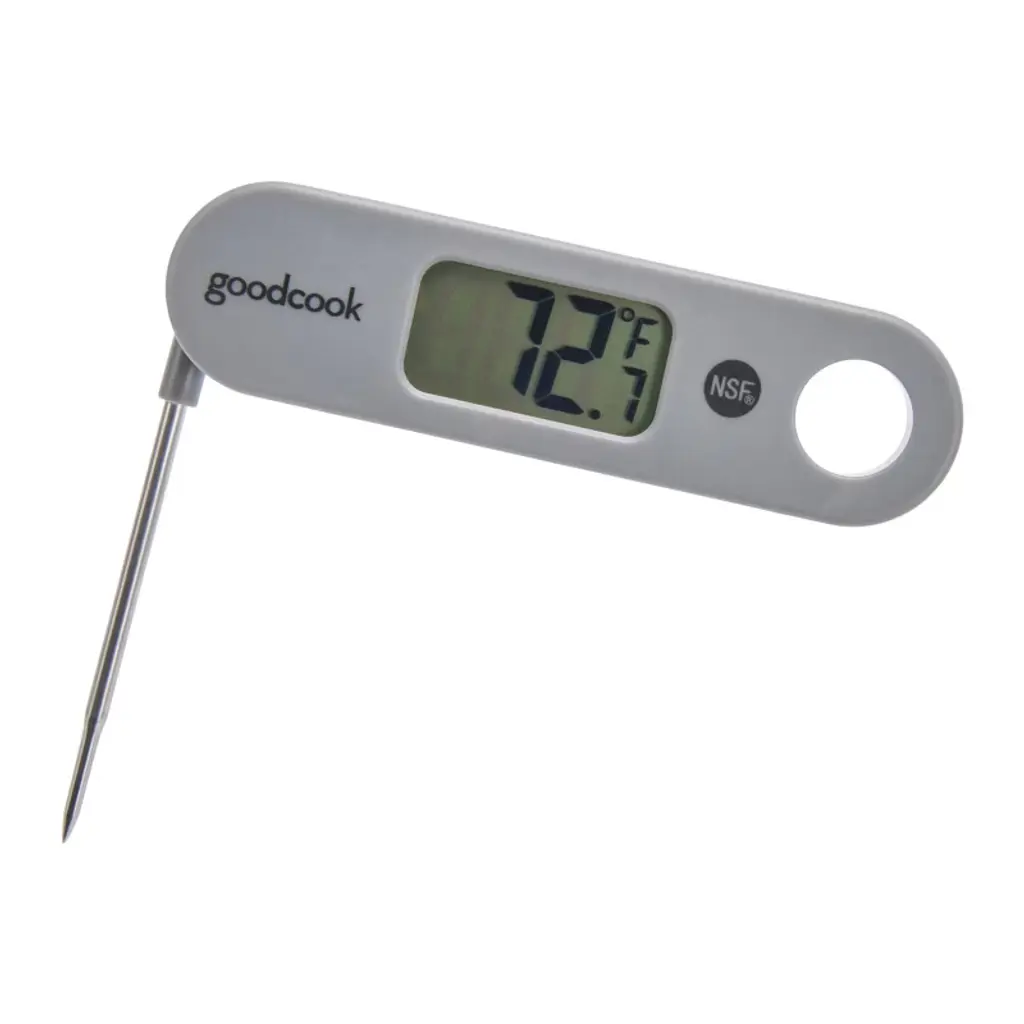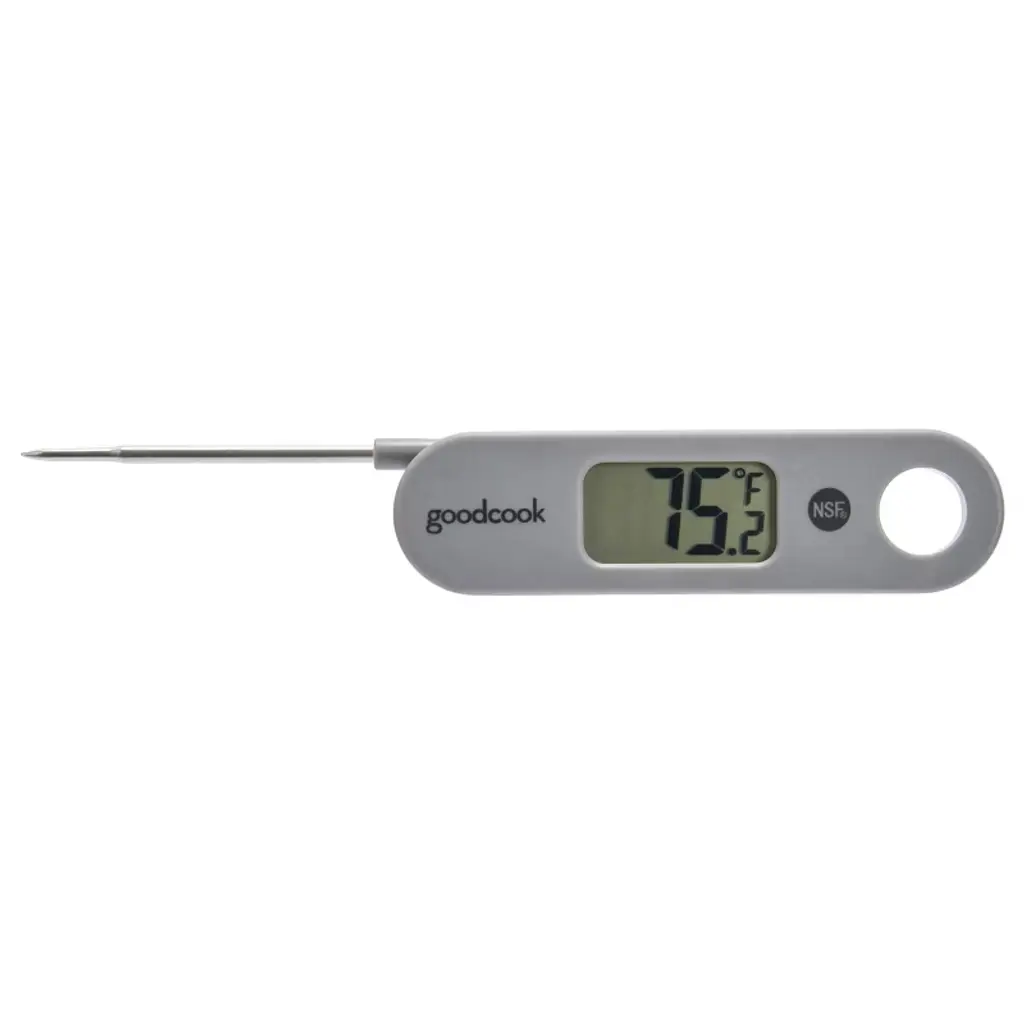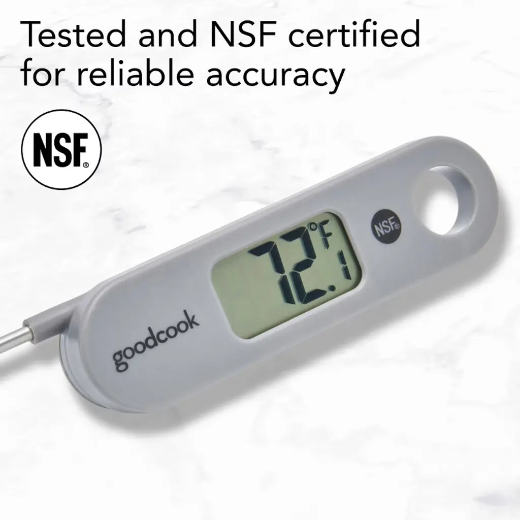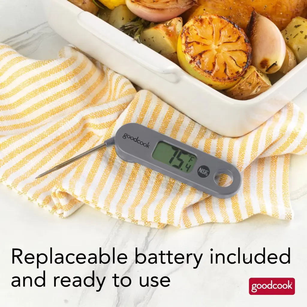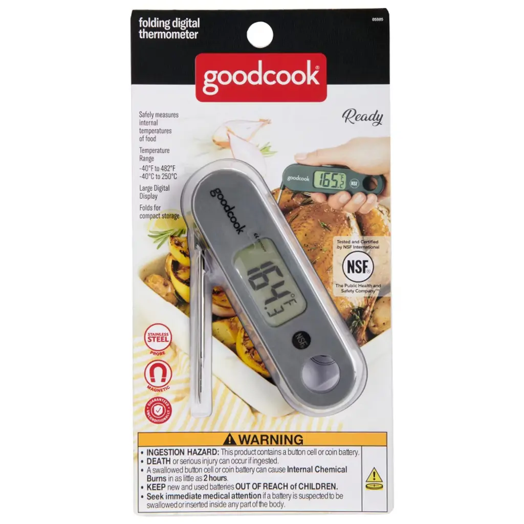 Our GoodCook Ready Folding Digital Thermometer can accurately measure the internal temperature of meats and poultry for food safety when cooking. The stainless steel probe stays positioned at various angles for the perfect reach when measuring, and folds away completely for compact storage. A large easy to read LCD display can show temperatures in either Fahrenheit or Celsius and will shut itself off after 5 minutes of inactivity. This thermometer has been tested and certified by NSF for reliable and accurate readings.