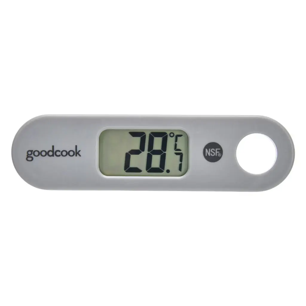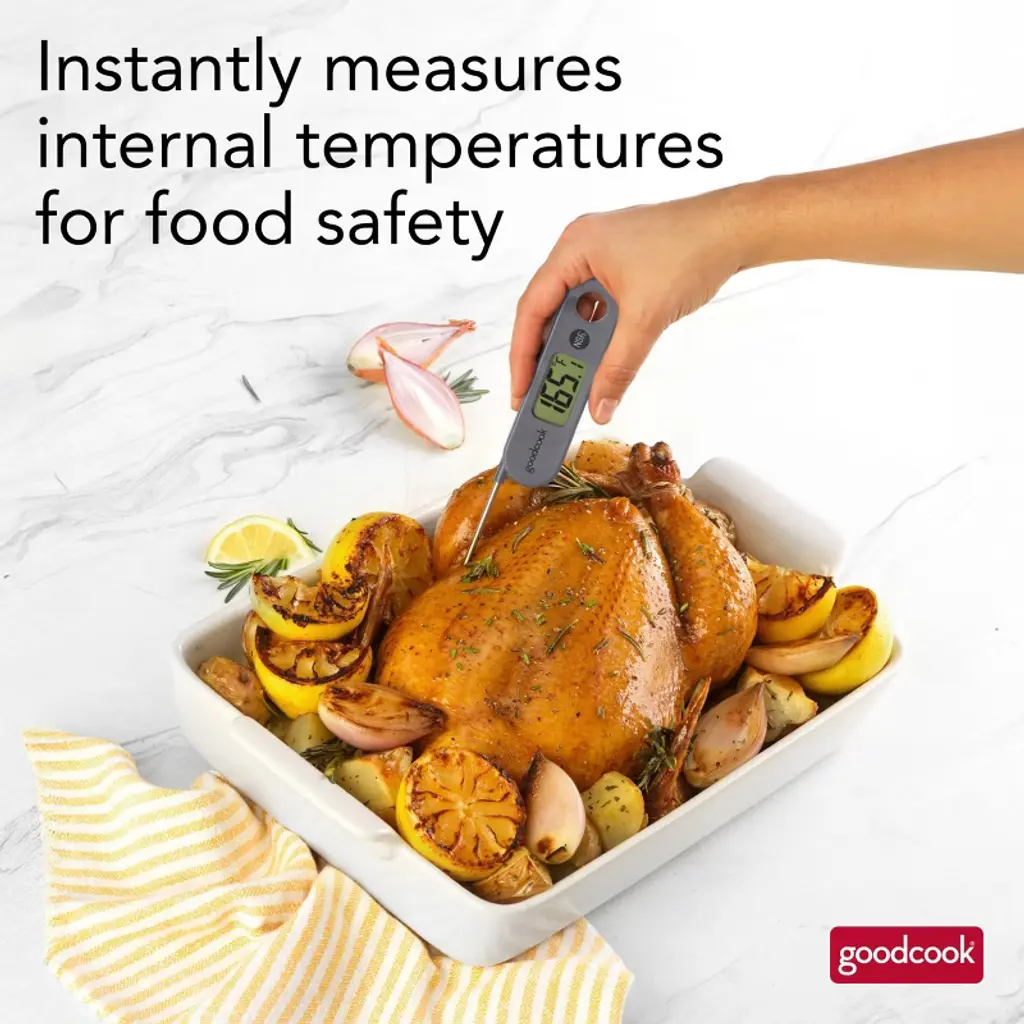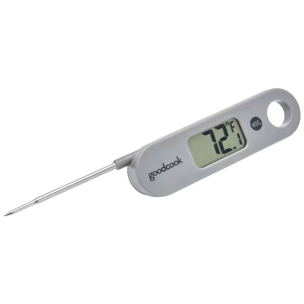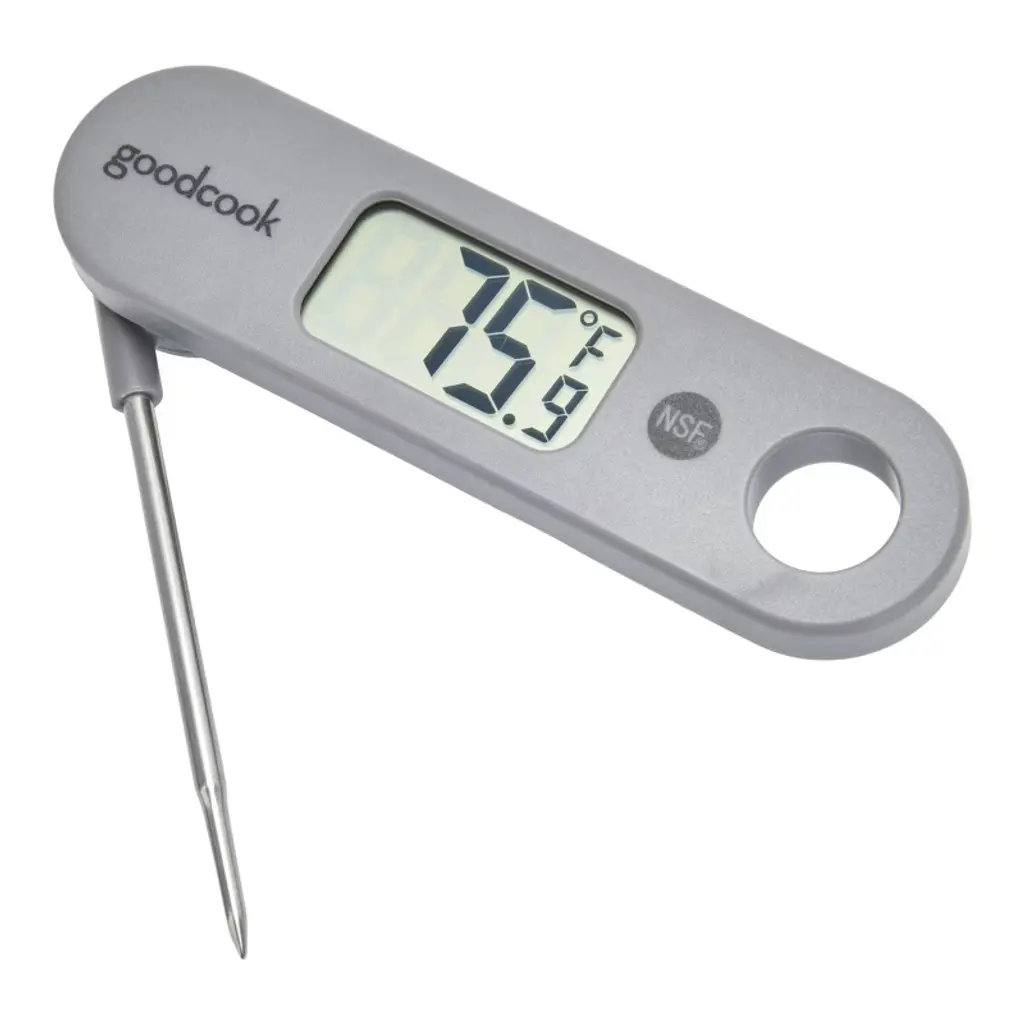 Our GoodCook Ready Folding Digital Thermometer can accurately measure the internal temperature of meats and poultry for food safety when cooking. The stainless steel probe stays positioned at various angles for the perfect reach when measuring, and folds away completely for compact storage. A large easy to read LCD display can show temperatures in either Fahrenheit or Celsius and will shut itself off after 5 minutes of inactivity. This thermometer has been tested and certified by NSF for reliable and accurate readings.