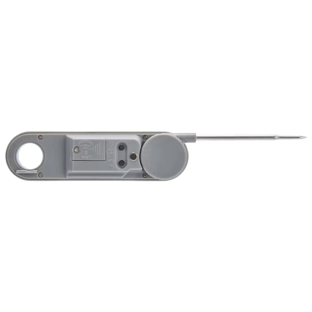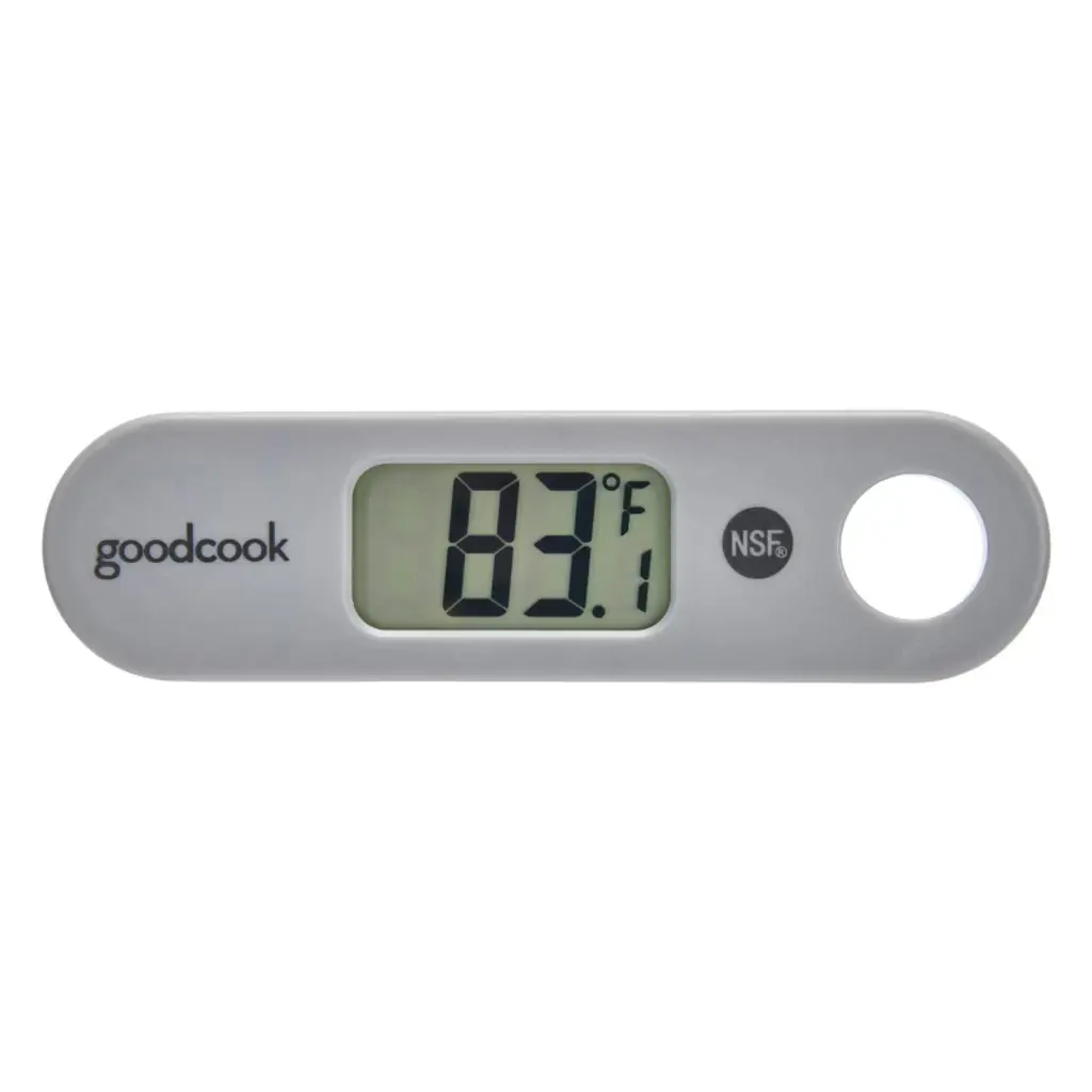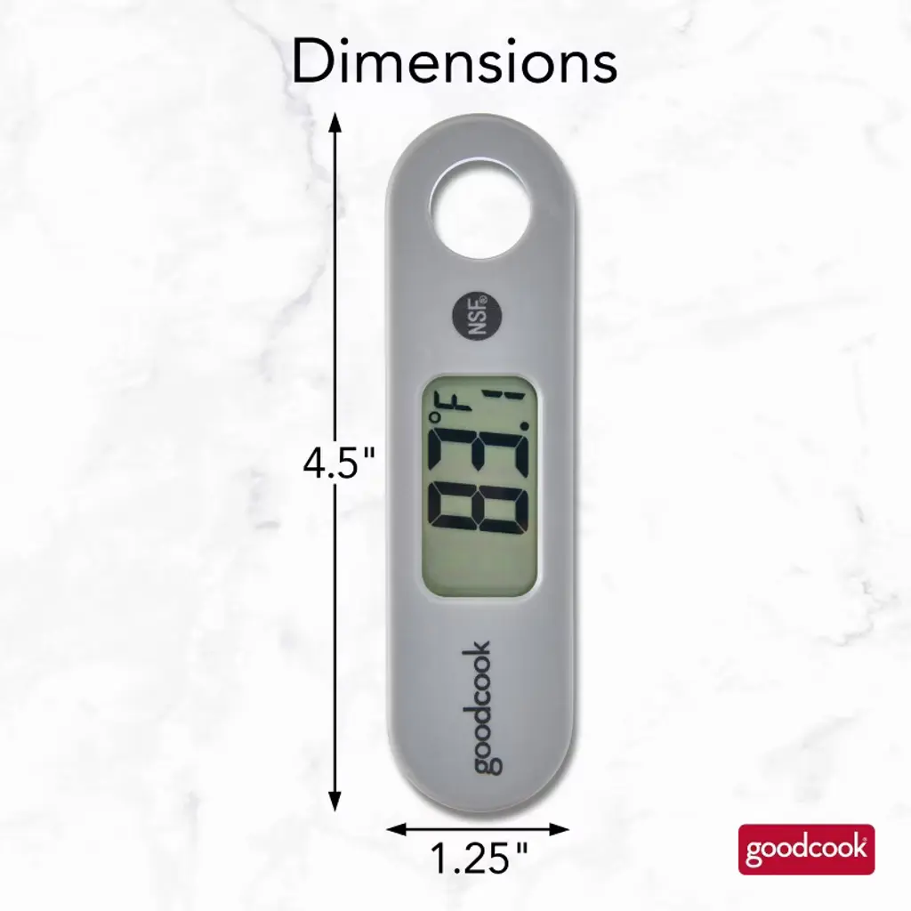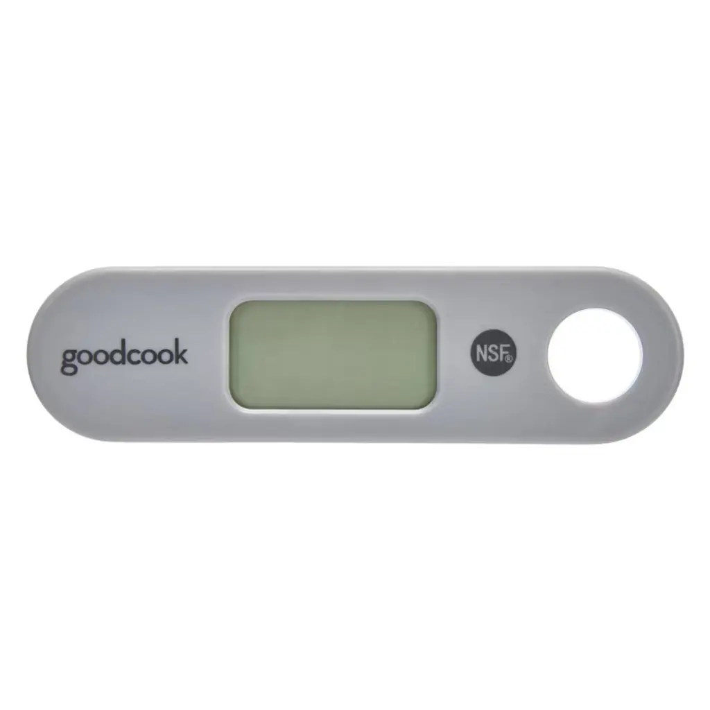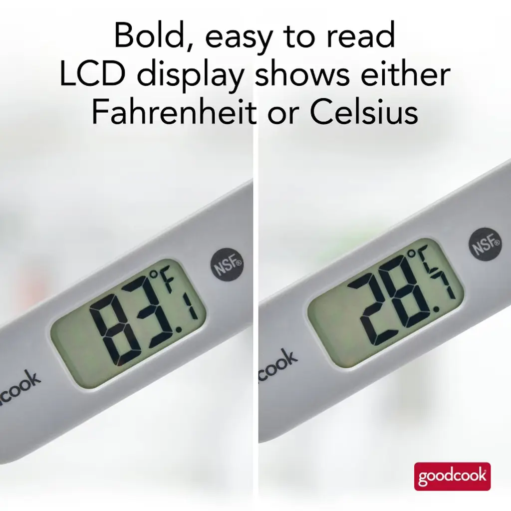 Our GoodCook Ready Folding Digital Thermometer can accurately measure the internal temperature of meats and poultry for food safety when cooking. The stainless steel probe stays positioned at various angles for the perfect reach when measuring, and folds away completely for compact storage. A large easy to read LCD display can show temperatures in either Fahrenheit or Celsius and will shut itself off after 5 minutes of inactivity. This thermometer has been tested and certified by NSF for reliable and accurate readings.
