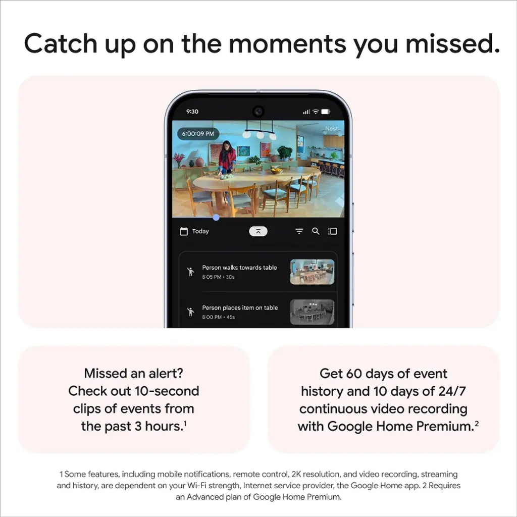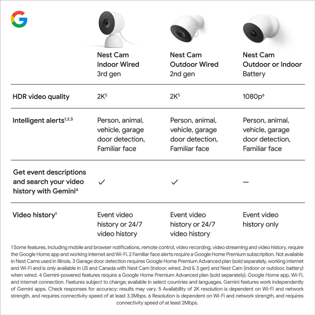 Meet the smarter, sharper wired Nest Cam Indoor with 2K video and Gemini. Get more peace of mind about the things that matter with the intelligence of Google Home. It provides more details, summarizes what happened, and lets you search video history simply by asking for something.1,2,3. 1 Compared to earlier Nest Cam models.2 Availability of 2K resolution is dependent on Wi-Fi and network strength, and requires connectivity speed of at least 3.3Mbps.3 Requires Google Home Premium Advanced plan (sold separately), Google Home app, Wi-Fi, and internet connection. Features subject to change; available in select countries and languages. Gemini features work independently of Gemini apps. Check responses for accuracy; results may vary.