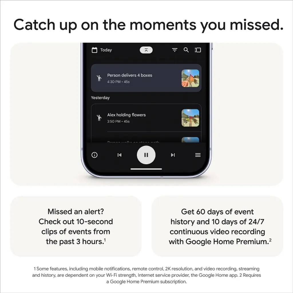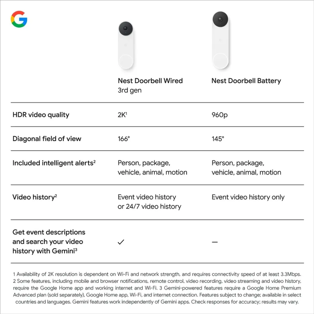 Meet the smarter, sharper wired Nest Doorbell with 2K video and Gemini.1 Get more peace of mind about the things that matter with the intelligence of Google Home. It provides more details, summarizes what happened, and lets you search video history simply by asking for something.2,3. 1 Compared to earlier Nest Cam models.2 Availability of 2K resolution is dependent on Wi-Fi and network strength, and requires connectivity speed of at least 3.3Mbps.3 Requires Google Home Premium Advanced plan (sold separately), Google Home app, Wi-Fi, and internet connection. Features subject to change; available in select countries and languages. Gemini features work independently of Gemini apps. Check responses for accuracy; results may vary.