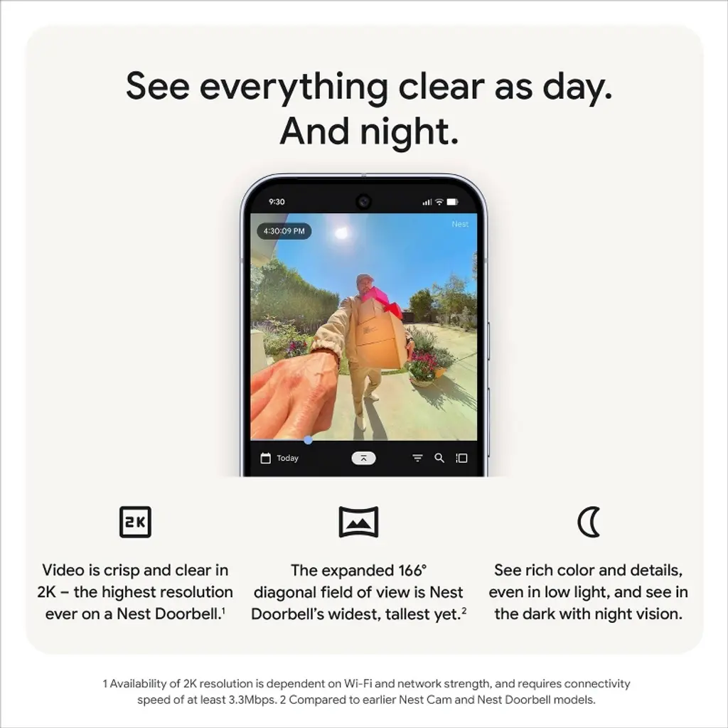 Meet the smarter, sharper wired Nest Doorbell with 2K video and Gemini.1 Get more peace of mind about the things that matter with the intelligence of Google Home. It provides more details, summarizes what happened, and lets you search video history simply by asking for something.2,3. 1 Compared to earlier Nest Cam models.2 Availability of 2K resolution is dependent on Wi-Fi and network strength, and requires connectivity speed of at least 3.3Mbps.3 Requires Google Home Premium Advanced plan (sold separately), Google Home app, Wi-Fi, and internet connection. Features subject to change; available in select countries and languages. Gemini features work independently of Gemini apps. Check responses for accuracy; results may vary.