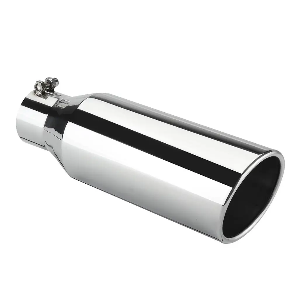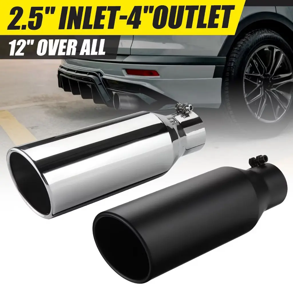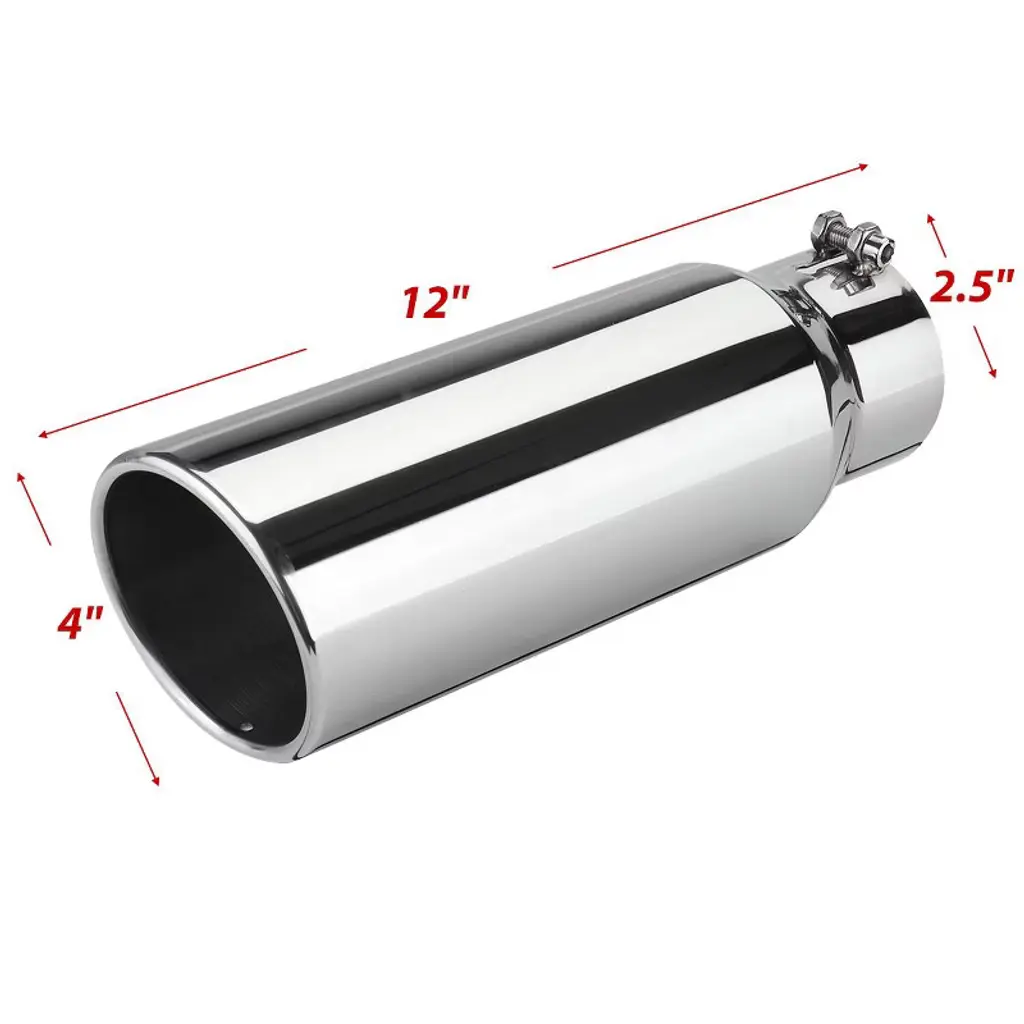 Upgrade your ride with our sleek Angle Cut Exhaust Tip! Designed for easy installation, this stylish black and silver accessory adds a sporty touch to your vehicle without any fuss, no welding or special tools needed!Crafted to withstand high temperatures and resist rust, it keeps its shine for years to come. Plus, the smart water drainage feature helps prevent corrosion, so you can hit the road with confidence. With a perfect 2.5" inlet and 4" outlet, it's not just about looks. It enhances exhaust flow too!Make your car a statement of style and performance, grab yours today and let your personality shine on the road!SPECIFICATIONSType: Exhaust Tip, Tail PipeDesign: Angle Cut - Rolled EdgePlacement on Vehicle: RearColor: Black, SilverInlet Tip Diameter: 2.5 inchesOutlet Tip Diameter: 4 inchesOverall Length: 12 inchesFITMENTUniversal fit for most of vehiclesPACKAGE INCLUDED1 x Exhaust TipNOTICE-We provide clear pictures, measurements where possible. Please check as much as possible to make sure the item is the one that you need.-All dimensions are measured by hand, Please allow 0.5-1 inch difference due to manual measurement. (1inch=2.54cm)-There is no instruction included. Professional installation is highly recommended. If you want to know how to use or install it, please contact us by Email!