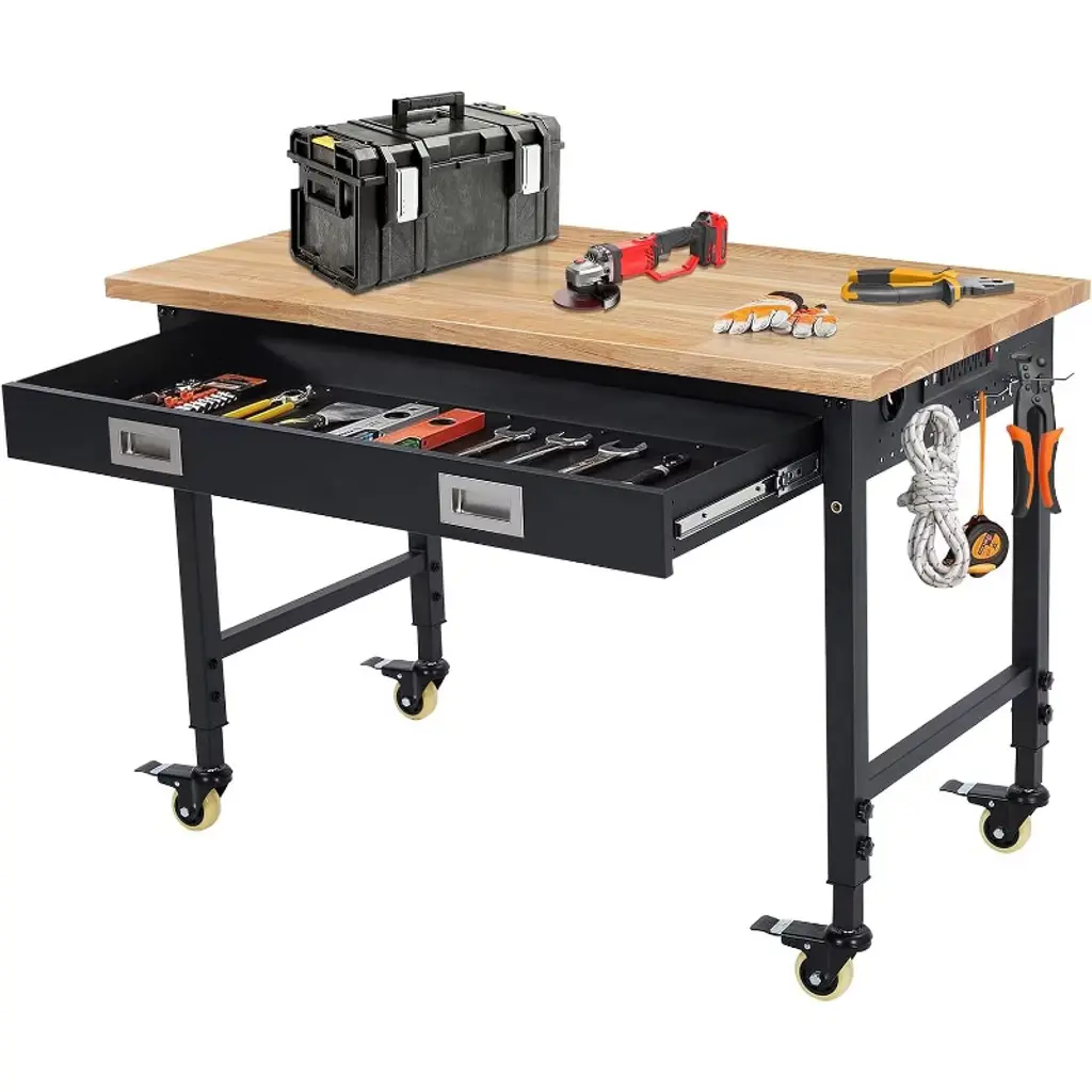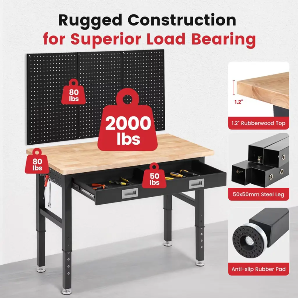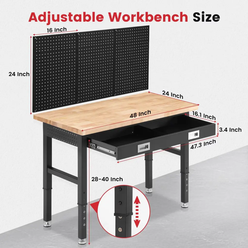 Built Tough, Works Smarter, Your All-in-One Workbench Solution.Level up your workspace with this heavy-duty rubberwood workbench, built to handle up to 2000 lbs of serious work. The 30mm solid top is sealed with protective varnish for long-lasting durability. With adjustable height (28"-40"), it's perfect for your garage, shop, home office, or crafting corner.Get organized fast with spacious drawers, dual pegboards, and built-in ETL-certified outlets, plus cord organizers to keep it all neat. The 2x2" steel legs and H-frame design offer rock-solid stability, while adjustable feet keep things level on any floor.Whether you're a DIYer, woodworker, or pro, this bench is your new power tool BFF. Great for small space storage, tool organization, and garage upgrades.SPECIFICATIONSSize: 40" H x 48" W x 24" DFeatures: Adjustable, Heavy-Duty, Tool OrganizerMaterial: rubber woodPACKAGING INCLUDES1 x Woodworking TableCONTACT USIf you have any problems with our items or services, please feel free to contact us any time.We are always online and do our best to solve your problems and provide you with the best customer services.