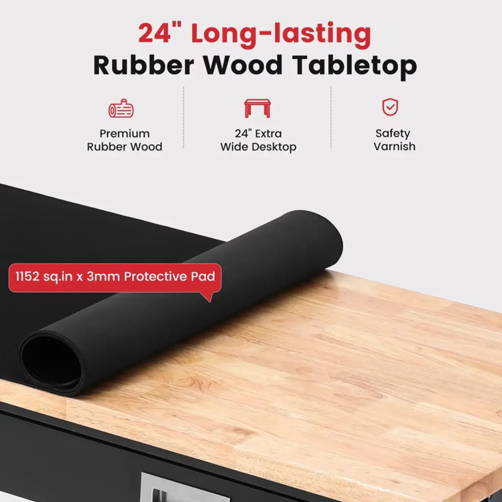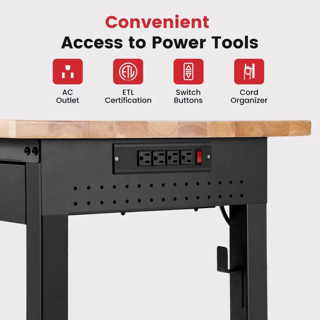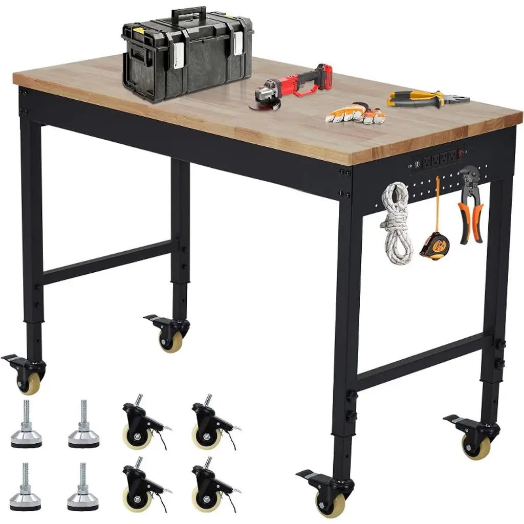 Built Tough, Works Smarter, Your All-in-One Workbench Solution.Level up your workspace with this heavy-duty rubberwood workbench, built to handle up to 2000 lbs of serious work. The 30mm solid top is sealed with protective varnish for long-lasting durability. With adjustable height (28"-40"), it's perfect for your garage, shop, home office, or crafting corner.Get organized fast with spacious drawers, dual pegboards, and built-in ETL-certified outlets, plus cord organizers to keep it all neat. The 2x2" steel legs and H-frame design offer rock-solid stability, while adjustable feet keep things level on any floor.Whether you're a DIYer, woodworker, or pro, this bench is your new power tool BFF. Great for small space storage, tool organization, and garage upgrades.SPECIFICATIONSSize: 40" H x 48" W x 24" DFeatures: Adjustable, Heavy-Duty, Tool OrganizerMaterial: rubber woodPACKAGING INCLUDES1 x Woodworking TableCONTACT USIf you have any problems with our items or services, please feel free to contact us any time.We are always online and do our best to solve your problems and provide you with the best customer services.