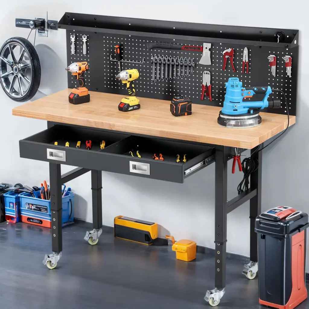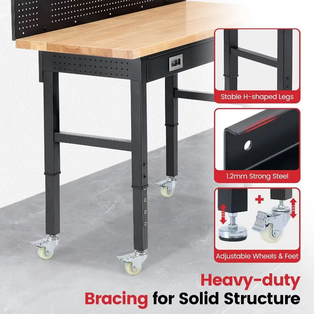 Your Ultimate Workbench, Bright, Tough & Built for More!Light up your DIY game with this heavy-duty adjustable workbench, perfect for garages, basements, craft rooms, and home workshops. With built-in LED lighting, smart tool storage (drawers + pegboard + hooks), and industrial-grade strength (supports up to 2000 lbs!), this bench is a serious upgrade. Customize the height (28–40") for standing or seated work, and roll it anywhere with 4 lockable wheels.Whether you are into woodworking, crafting, repairs, or hobbies, this versatile utility table fits your space and your workflow.SPECIFICATIONSFeatures: Adjustable, Heavy-Duty, Portable, Rolling, Storage, Tool OrganizerMaterial: rubber wood , Stainless SteelSize: 60" X 22"PACKAGING INCLUDES1 x Woodworking TableCONTACT USIf you have any problems with our items or services, please feel free to contact us any time.We are always online and do our best to solve your problems and provide you with the best customer services.