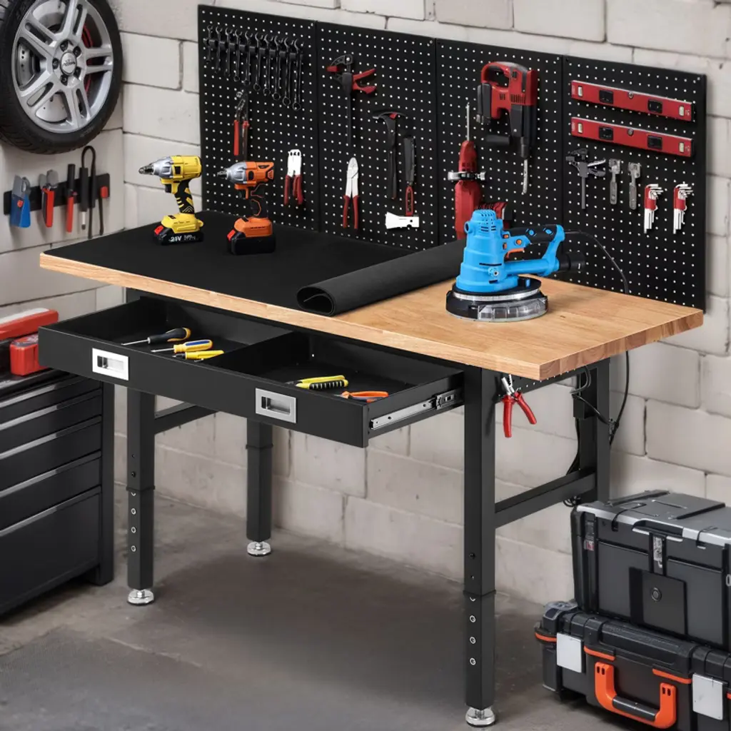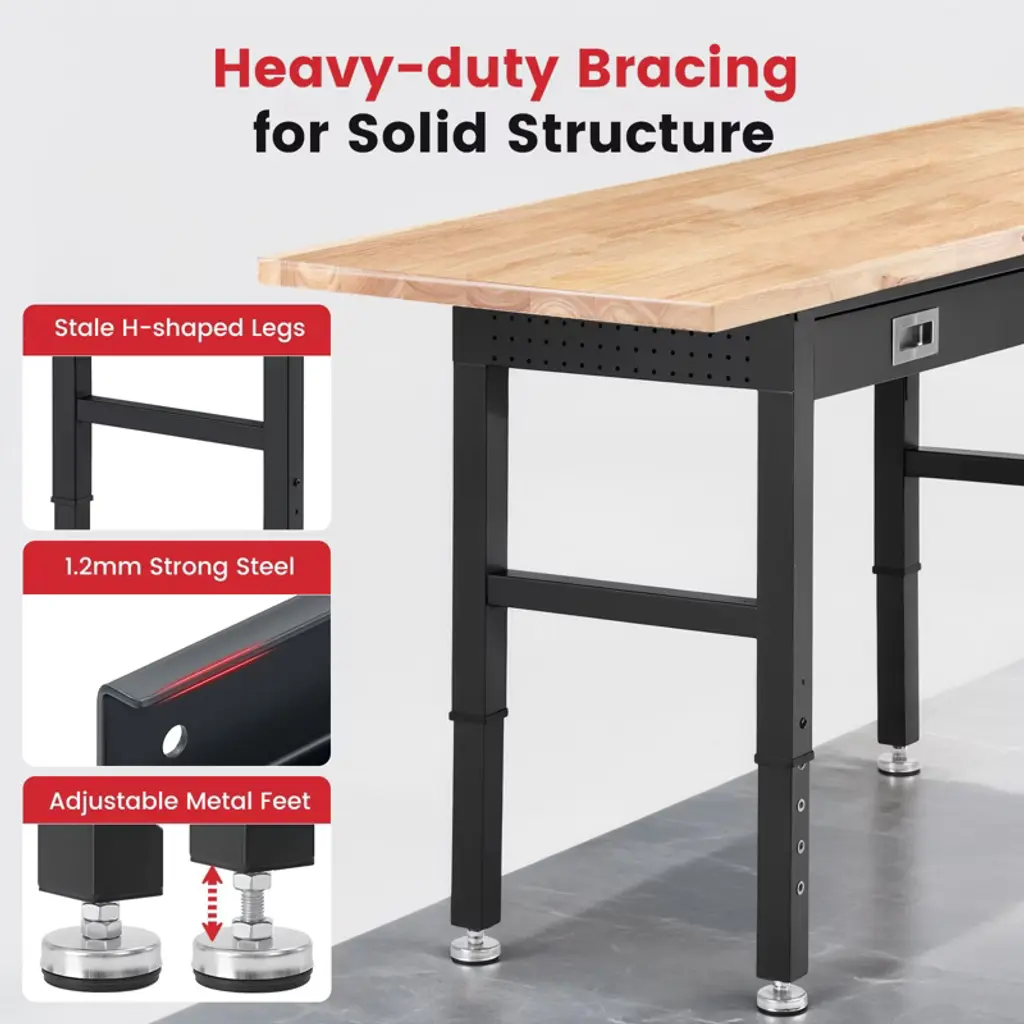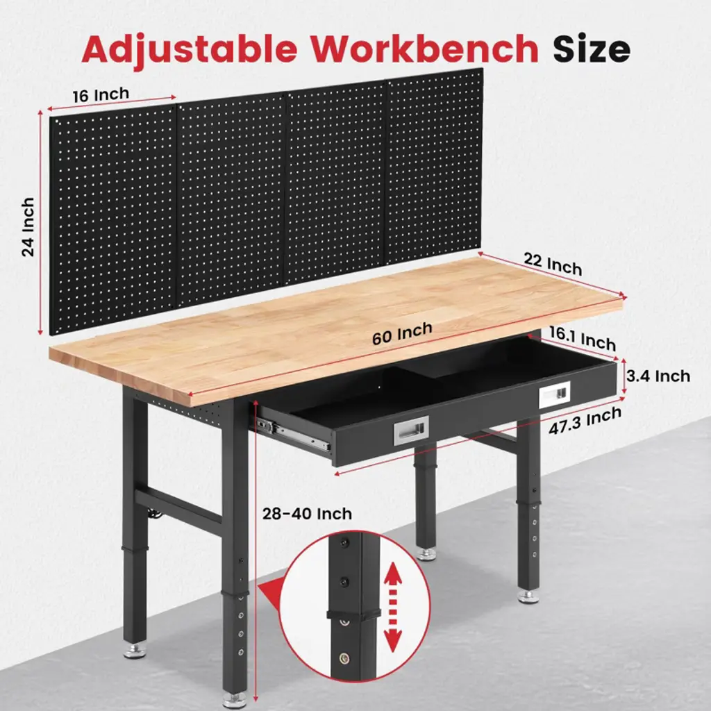 Tackle Every Project with Power & Precision , The Ultimate Adjustable Workbench.Ready to upgrade your garage or workshop? This heavy-duty adjustable workbench is built for serious work, with a solid 30mm rubberwood top that handles up to 2000 lbs. Store smarter with 4 pegboards, easy-glide drawers, and built-in cord organizers. Plus, power up safely with ETL-certified outlets and an on/off switch, right where you need them.The sturdy 2x2" steel legs and H-frame keep things rock solid, even on uneven floors thanks to adjustable, anti-slip feet. Height adjustable from 28" to 40", it’s perfect for everything from woodworking and crafting to tool repair and garage storage.-Ideal for garages, workshops, and makerspaces-Built-in power station, less clutter, more productivity-No-drill assembly, hassle-free setupSPECIFICATIONSSize: 40" H x 60" W x 24" DFeatures: Adjustable, Heavy-Duty, Tool OrganizerMaterial: rubber woodPACKAGING INCLUDES1 x Woodworking TableCONTACT USIf you have any problems with our items or services, please feel free to contact us any time.We are always online and do our best to solve your problems and provide you with the best customer services.