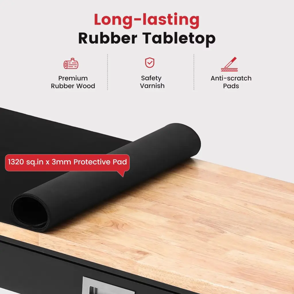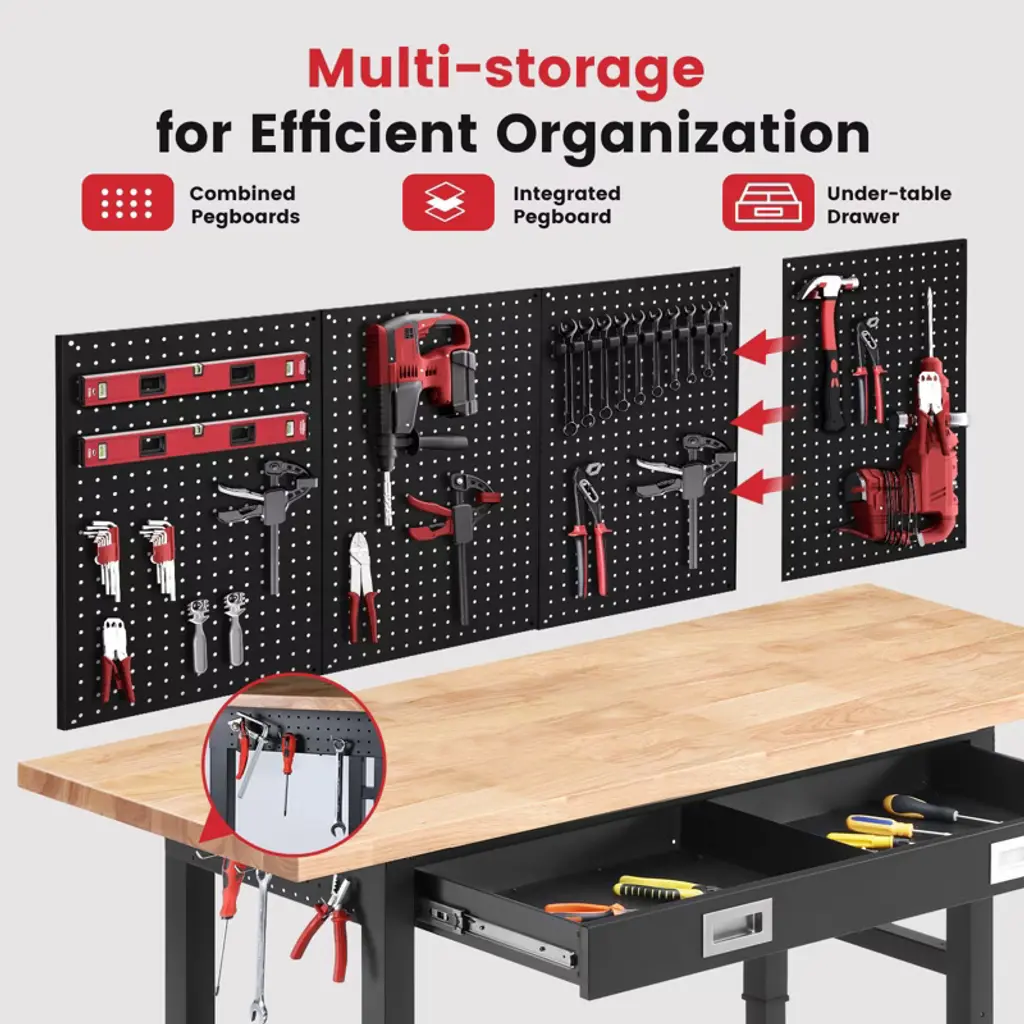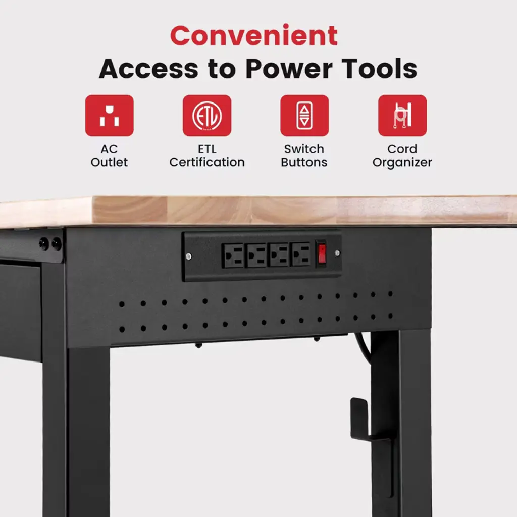 Tackle Every Project with Power & Precision , The Ultimate Adjustable Workbench.Ready to upgrade your garage or workshop? This heavy-duty adjustable workbench is built for serious work, with a solid 30mm rubberwood top that handles up to 2000 lbs. Store smarter with 4 pegboards, easy-glide drawers, and built-in cord organizers. Plus, power up safely with ETL-certified outlets and an on/off switch, right where you need them.The sturdy 2x2" steel legs and H-frame keep things rock solid, even on uneven floors thanks to adjustable, anti-slip feet. Height adjustable from 28" to 40", it’s perfect for everything from woodworking and crafting to tool repair and garage storage.-Ideal for garages, workshops, and makerspaces-Built-in power station, less clutter, more productivity-No-drill assembly, hassle-free setupSPECIFICATIONSSize: 40" H x 60" W x 24" DFeatures: Adjustable, Heavy-Duty, Tool OrganizerMaterial: rubber woodPACKAGING INCLUDES1 x Woodworking TableCONTACT USIf you have any problems with our items or services, please feel free to contact us any time.We are always online and do our best to solve your problems and provide you with the best customer services.