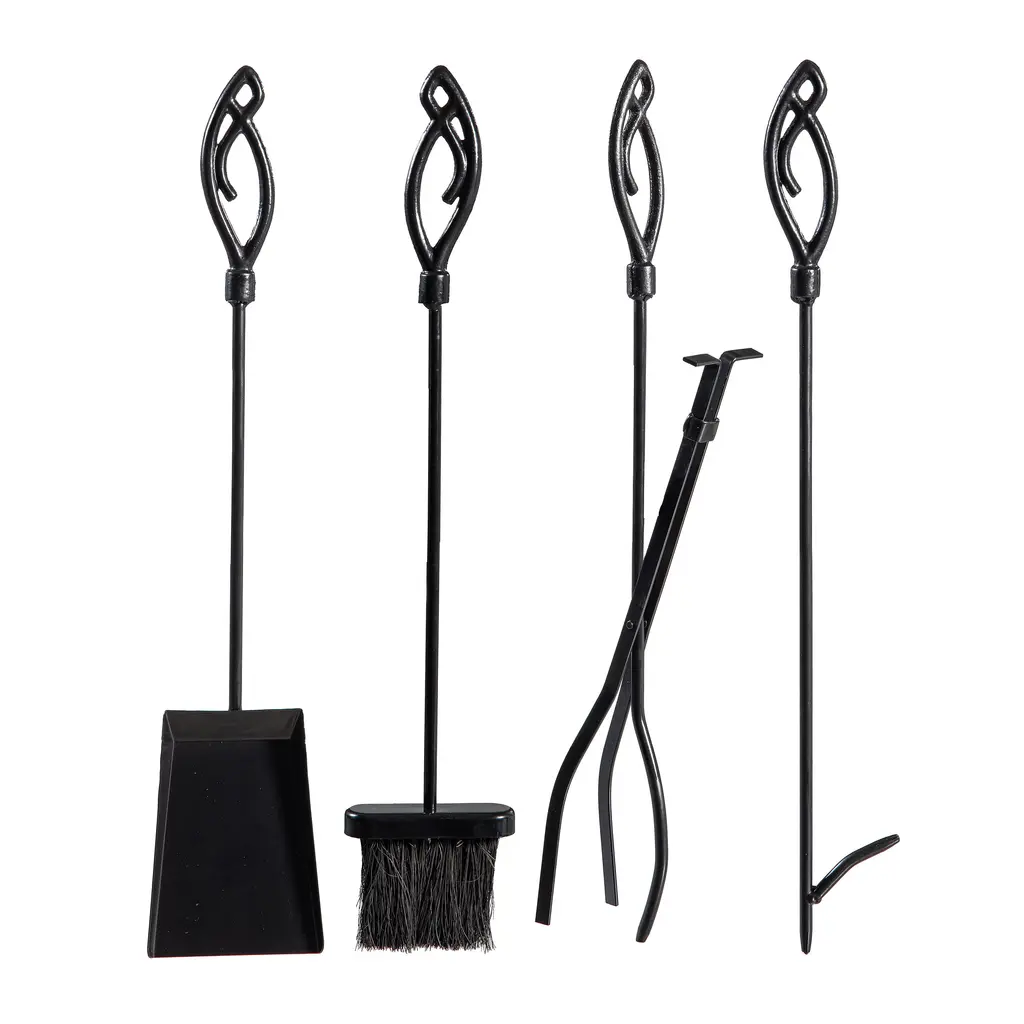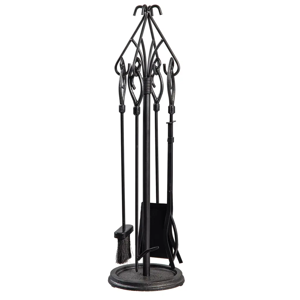 Elegant, forged scrollwork makes our Gothic 5 Piece Tool Set an attractive and functional addition to your hearth. Many extra details elevate the design and add style to your fireplace.Set includes a broom, poker, shovel, and tongs with loop handles for easy hanging on the sturdy stand. You'll have everything you need to safely add/position logs, stoke the fire and clean up the ashes.Powder-coated in an attractive graphite finish, this set is built to last for years of use by your fireplace, firepit, or wood stove. A lovely (and functional) addition to your hearth and home!