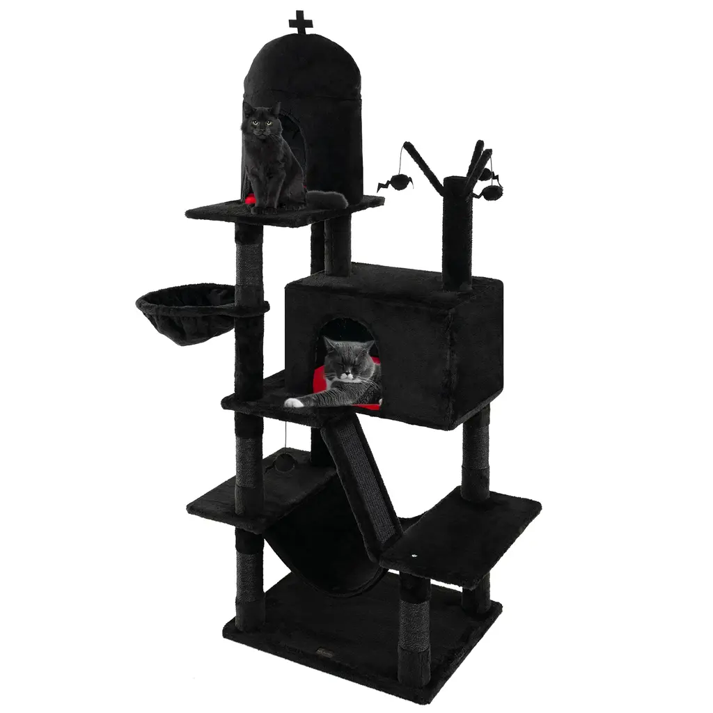 SpecificationsKey Features● Unleash Mysterious Ambience: With bat-shaped toys, a striking coffin-style beds, the versatile kitten tower exudes a sense of spookiness that is sure to capture cat's and people's attention. Its extra large back design adds to its allure, making it a statement piece in any room. ● Luxurious Resting Options: The large cat tree features a castle-style cat condo, providing your cats with a large kingdom to patrol. Moreover, the spacious condo, a cozy hammock, 2 oversized coffin beds and a basket bed allow furry friends to unwind and bask in different perspectives. ● Multi-level Playground: Designed to keep your cats entertained, the gothic kitty tree features 2 hanging toys for endless playtime. The multiple jumping platforms offer opportunities for your feline friends to engage in playful activities, promoting both physical and mental well-being. ● Sisal Scratching Posts: To release cats' natural scratching instincts, the multi-level activity center boasts multiple sisal scratching posts. Therefore, the kitty tower offers a perfect solution to protect your furniture from damage and promote a healthy outlet for cats' instincts.