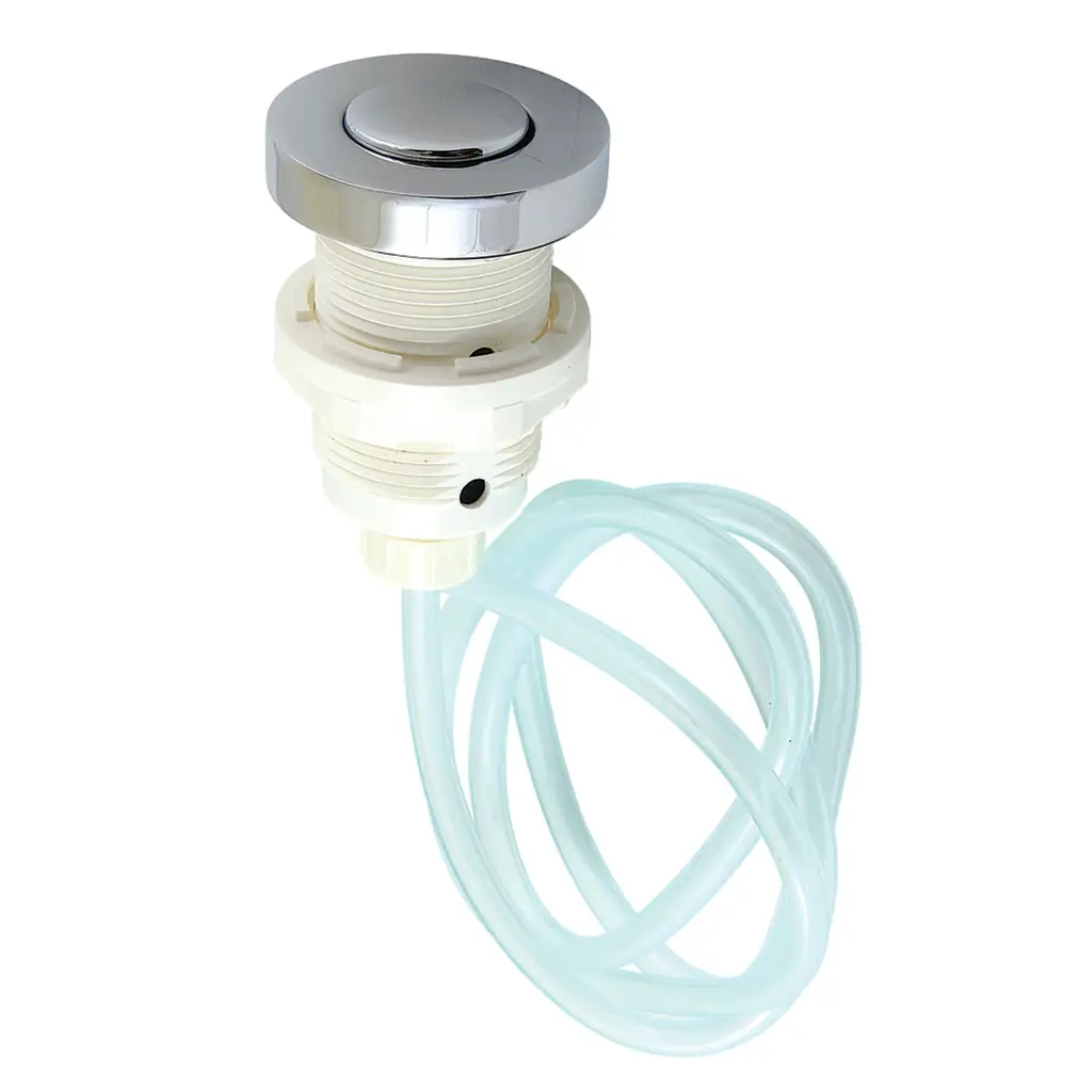 The disposal air switch button from Gourmetier is a convenient and stylish means to activate your disposal. The button, which can be mounted to the sink or the countertop, connects to a hose which plunges air activating the disposal. The brass button is available in a multitude of finishes (Chrome, brass, bronze, nickel) to complement the finish of your faucet and/or surrounding decor. This air switch button includes an air tube.FeaturesHigh quality brass air switch button cover and body1-11/32" O.D. tailpieceButton size: (L)1-7/8" x (W)1-7/8" x (H)7/16"Overall height: 2-7/8"Sold as a replacement to your existing air switch to any units with a 1/4" air hose connectionSafe, low profile air switch to operate your garbage disposalCan be installed with most pre-existing power modulesIncludes 39-3/8" plastic hoseEasy installation save you time and effortCorrosion-resistant finish