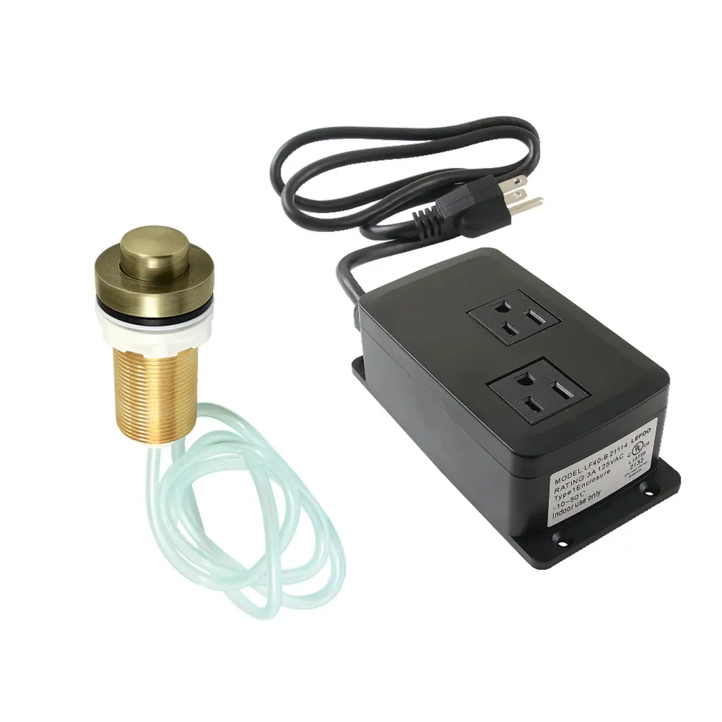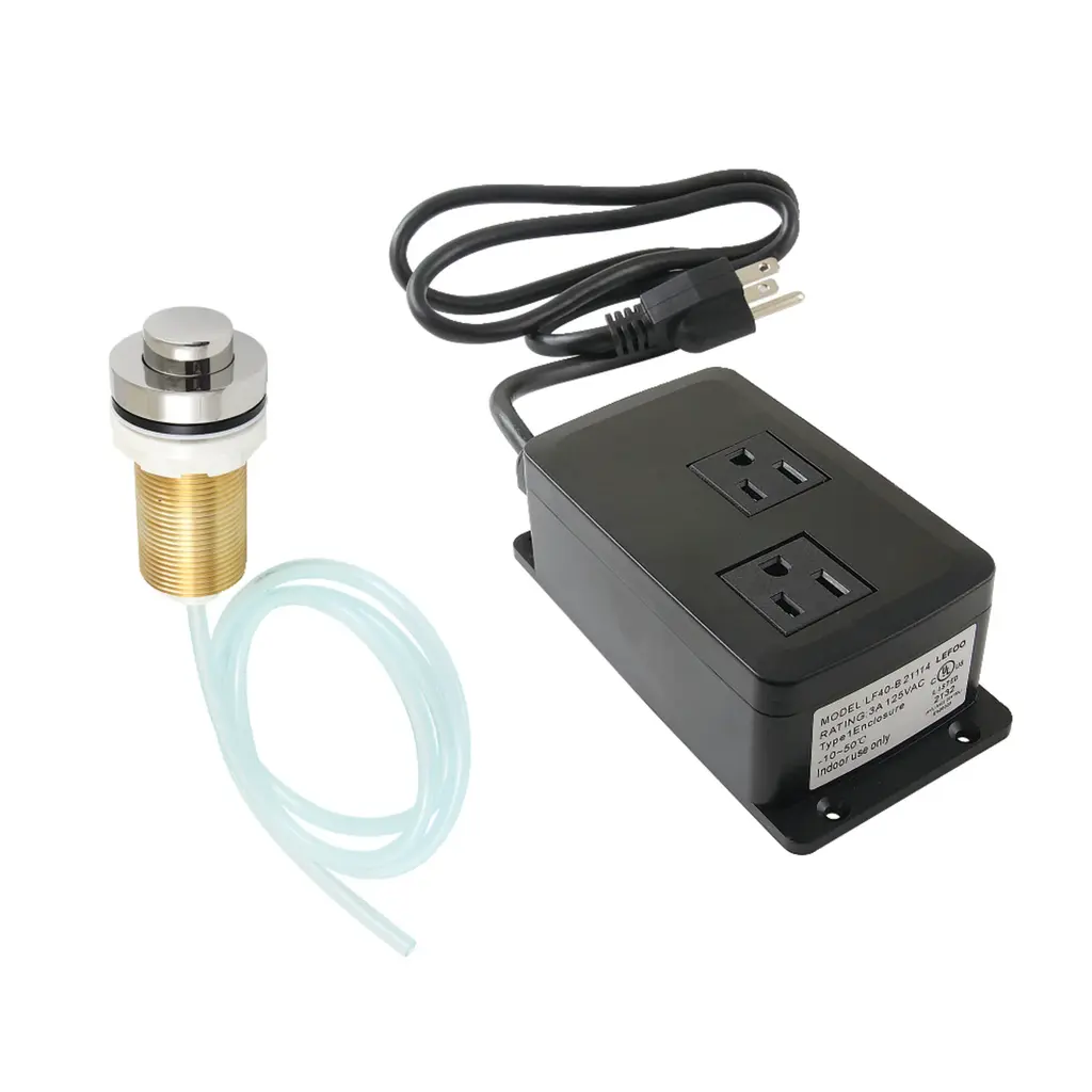 The disposal air switch button from Gourmetier is a convenient and stylish means to activate your disposal. The button, which can be mounted to the sink or the countertop, connects to a hose which plunges air activating the disposal. The brass button is available in a multitude of finishes (Chrome, brass, bronze, nickel) to complement the finish of your faucet and/or surrounding decor. This air switch kit includes: air switch button, air tube, and dual outlet power module.FeaturesFabricated from solid brass and ABS material1-11/32" O.D. tailpieceButton size: (L)1-3/4" x (W)1-3/4" x (H)13/16"Overall height: 3-11/16"Sold as a replacement to your existing air switch to any units with a 1/4" air hose connectionSafe, high profile air switch to operate your garbage disposalIncludes power moduleIncludes 39-3/8" plastic hoseEasy installation save you time and effort