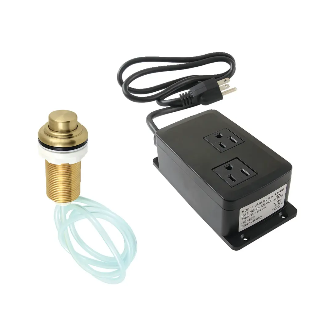The disposal air switch button from Gourmetier is a convenient and stylish means to activate your disposal. The button, which can be mounted to the sink or the countertop, connects to a hose which plunges air activating the disposal. The brass button is available in a multitude of finishes (Chrome, brass, bronze, nickel) to complement the finish of your faucet and/or surrounding decor. This air switch kit includes: air switch button, air tube, and dual outlet power module.FeaturesFabricated from solid brass and ABS material1-11/32" O.D. tailpieceButton size: (L)1-3/4" x (W)1-3/4" x (H)13/16"Overall height: 3-11/16"Sold as a replacement to your existing air switch to any units with a 1/4" air hose connectionSafe, high profile air switch to operate your garbage disposalIncludes power moduleIncludes 39-3/8" plastic hoseEasy installation save you time and effort
