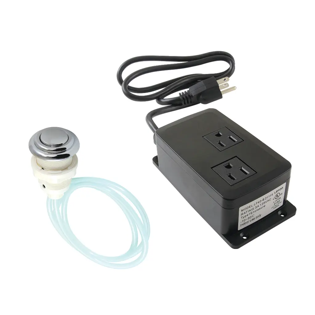 The disposal air switch button from Gourmetier is a convenient and stylish means to activate your disposal. The button, which can be mounted to the sink or the countertop, connects to a hose which plunges air activating the disposal. The brass button is available in a multitude of finishes (Chrome, brass, bronze, nickel) to complement the finish of your faucet and/or surrounding decor. This air switch kit includes: air switch button, air tube, and dual outlet power module.FeaturesSolid brass and ABS constructionAir switch gives you a safe way to operate your garbage disposalDual outlet gives you an extra outlet, not controlled by the air switch, perfect for additional appliances such as hot water dispenserInstalls on a standard 1-3/8" to 1-1/2" holeAir switch kit includes power module, air switch button, and air tubeAir switch can be installed in any convenient location such as cabinet front or on countertop within easy reach to persons with disabilitiesAll mounting hardware includedUL listed power modulePower Module Electrical Rating: 3A, 125VACFor indoor use only