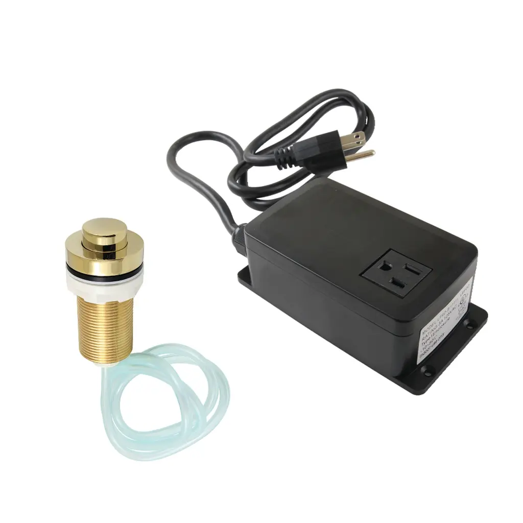 The disposal air switch button from Gourmetier is a convenient and stylish means to activate your disposal. The button, which can be mounted to the sink or the countertop, connects to a hose which plunges air activating the disposal. The brass button is available in a multitude of finishes (Chrome, brass, bronze, nickel) to complement the finish of your faucet and/or surrounding decor. This air switch kit includes: air switch button, air tube, and single outlet power module.FeaturesFabricated from solid brass and ABS material1-11/32" O.D. tailpieceButton size: (L)1-3/4" x (W)1-3/4" x (H)13/16"Overall height: 3-11/16"Sold as a replacement to your existing air switch to any units with a 1/4" air hose connectionSafe, high profile air switch to operate your garbage disposalIncludes power moduleIncludes 39-3/8" plastic hoseEasy installation save you time and effort