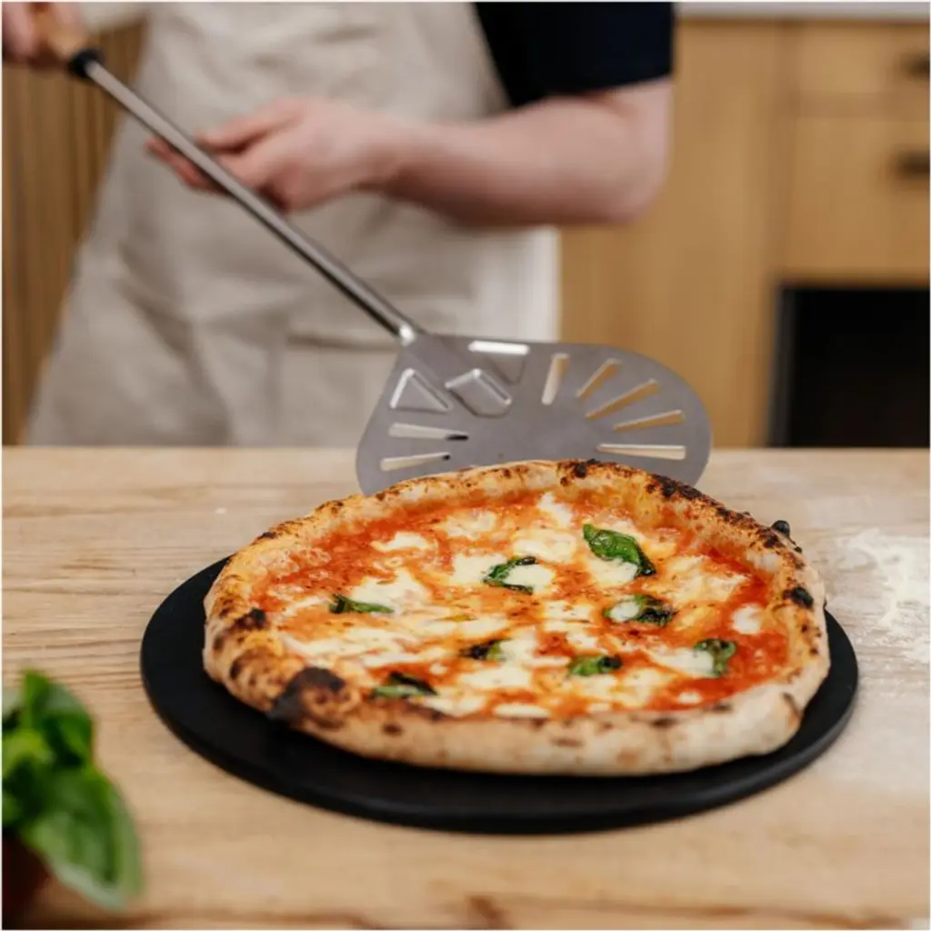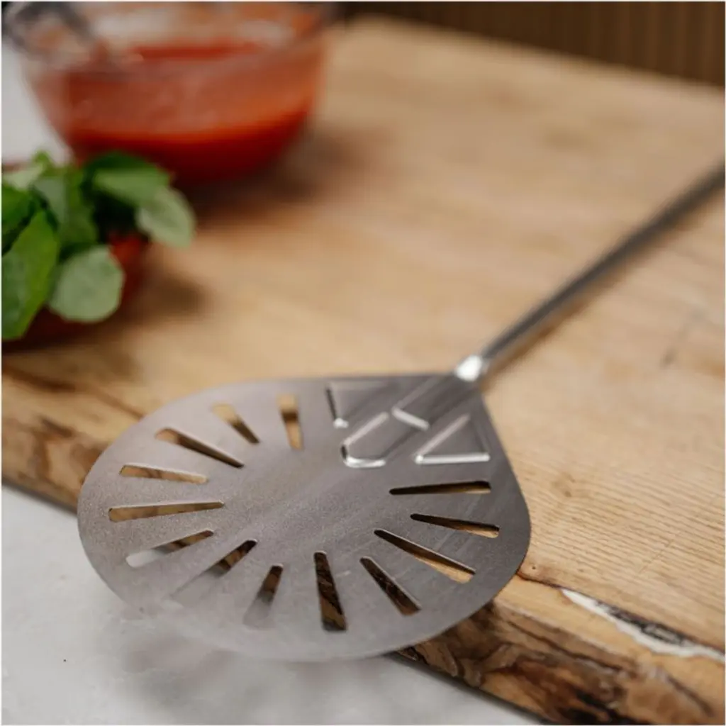 Rotate your pizzas in the oven smoothly and confidently with this well-balanced turning peel. The sustainably sourced wooden handle moves the center of gravity from the pizza to your hand, making it easier to turn pizzas as they bake. Perforated to allow excess flour to fall away, the teardrop-shaped aluminum blade spins pies easily without snagging. This lightweight peel is the perfect companion for our Gozney pizza ovens (sold separately).