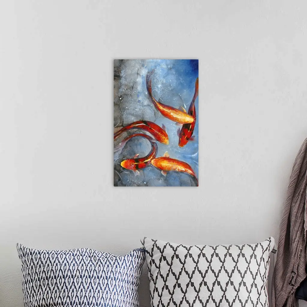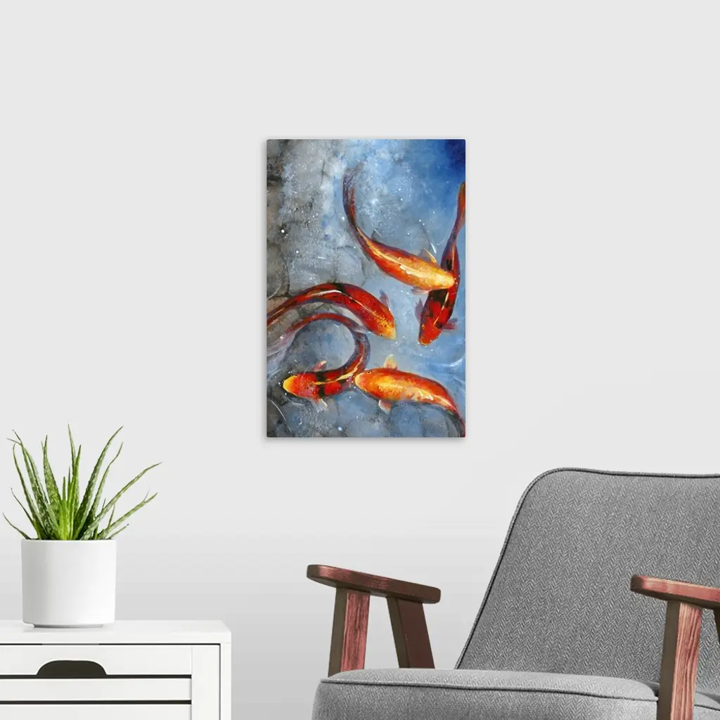 Bright red and orange koi fish swimming in a pond, seen from above.