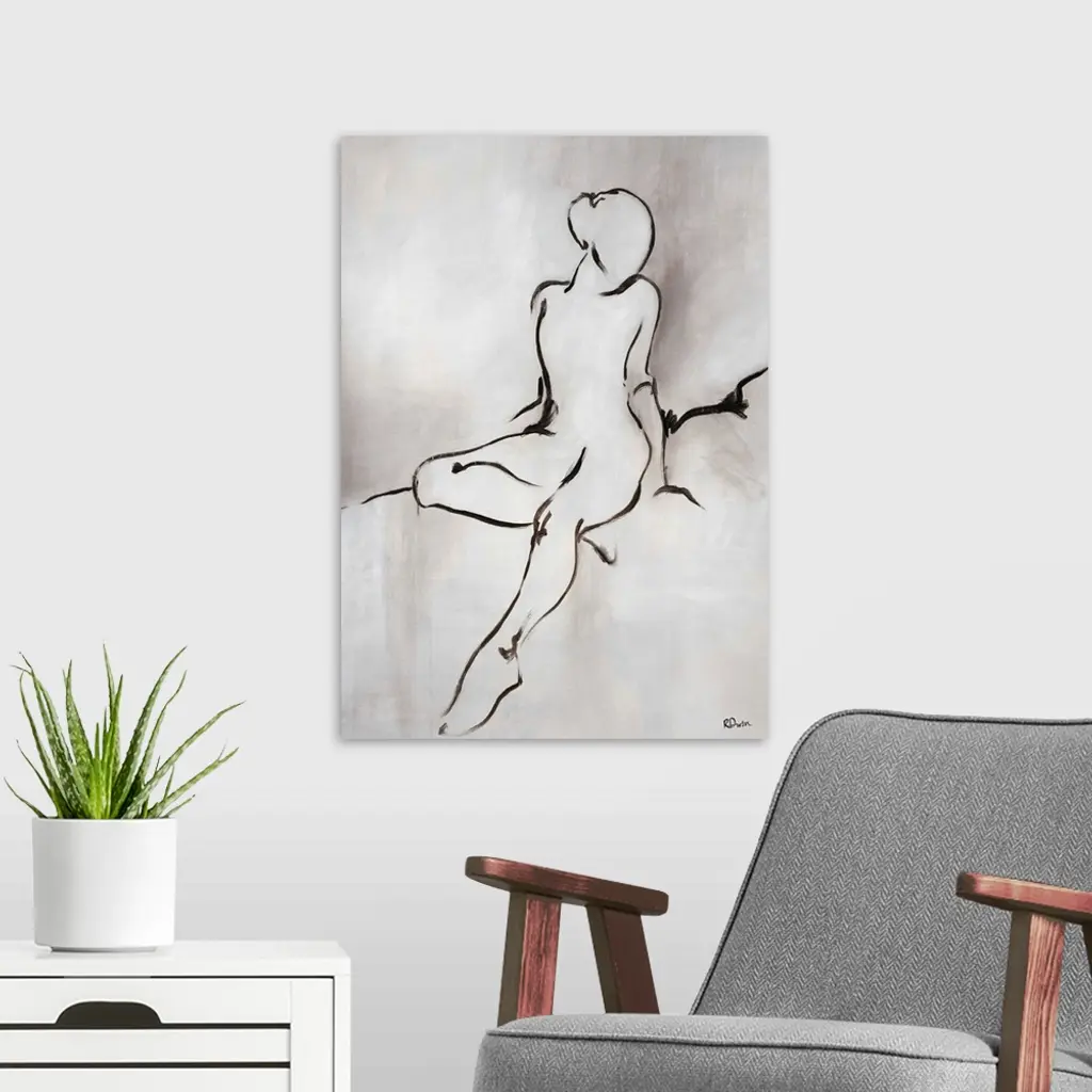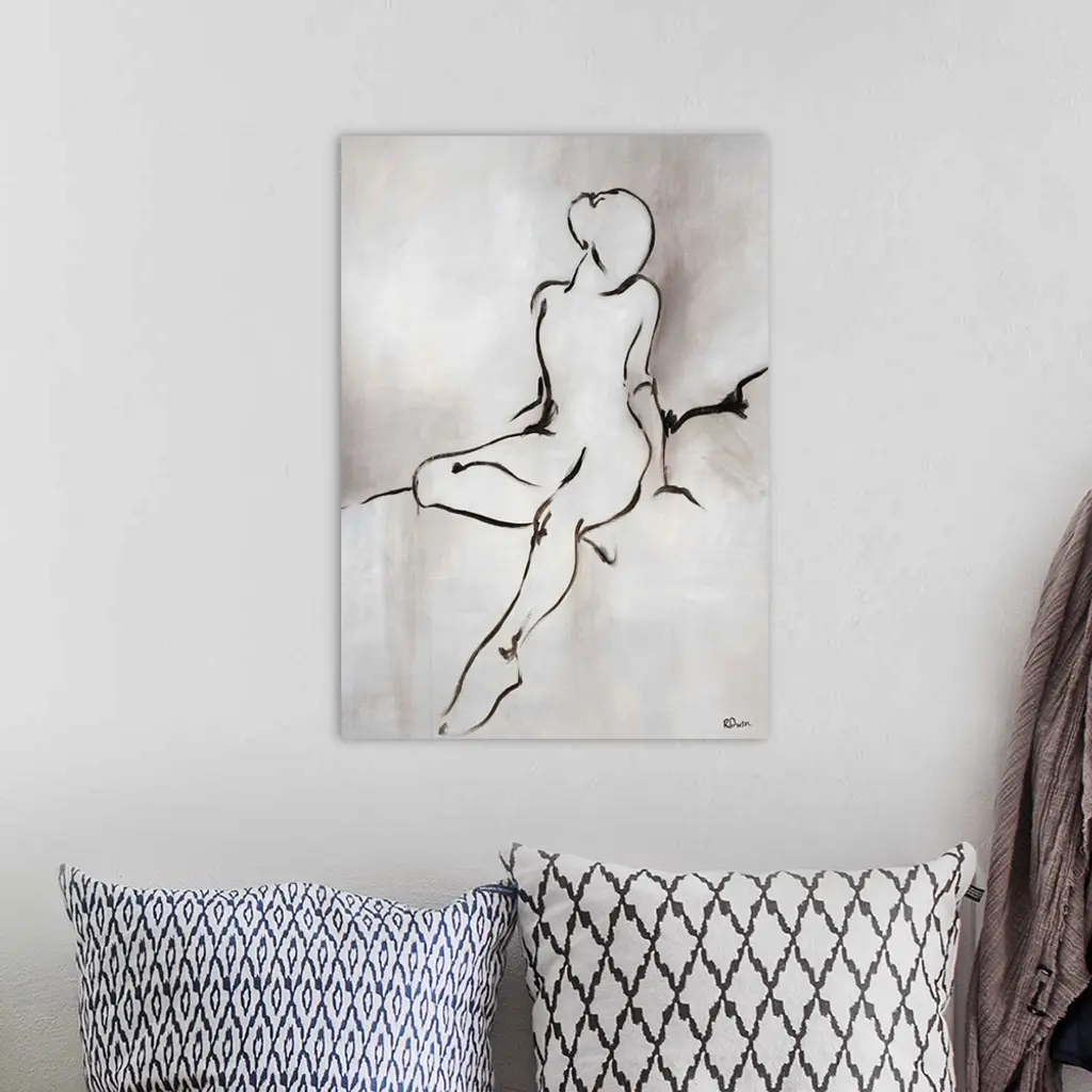 Figurative art in neutral tones of the outline of a woman sitting on a soft surface with one leg tucked under her other, and her arms behind her as she looks to the side.
