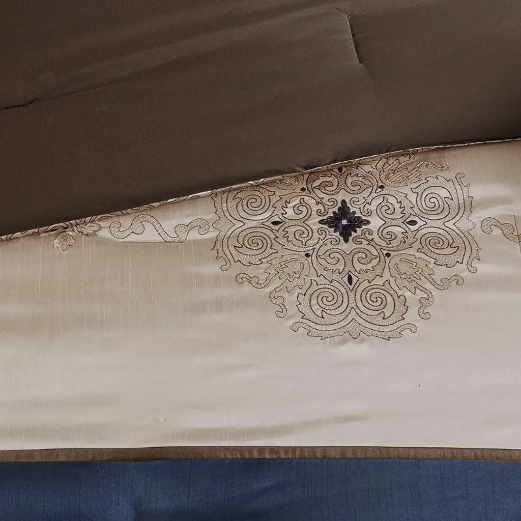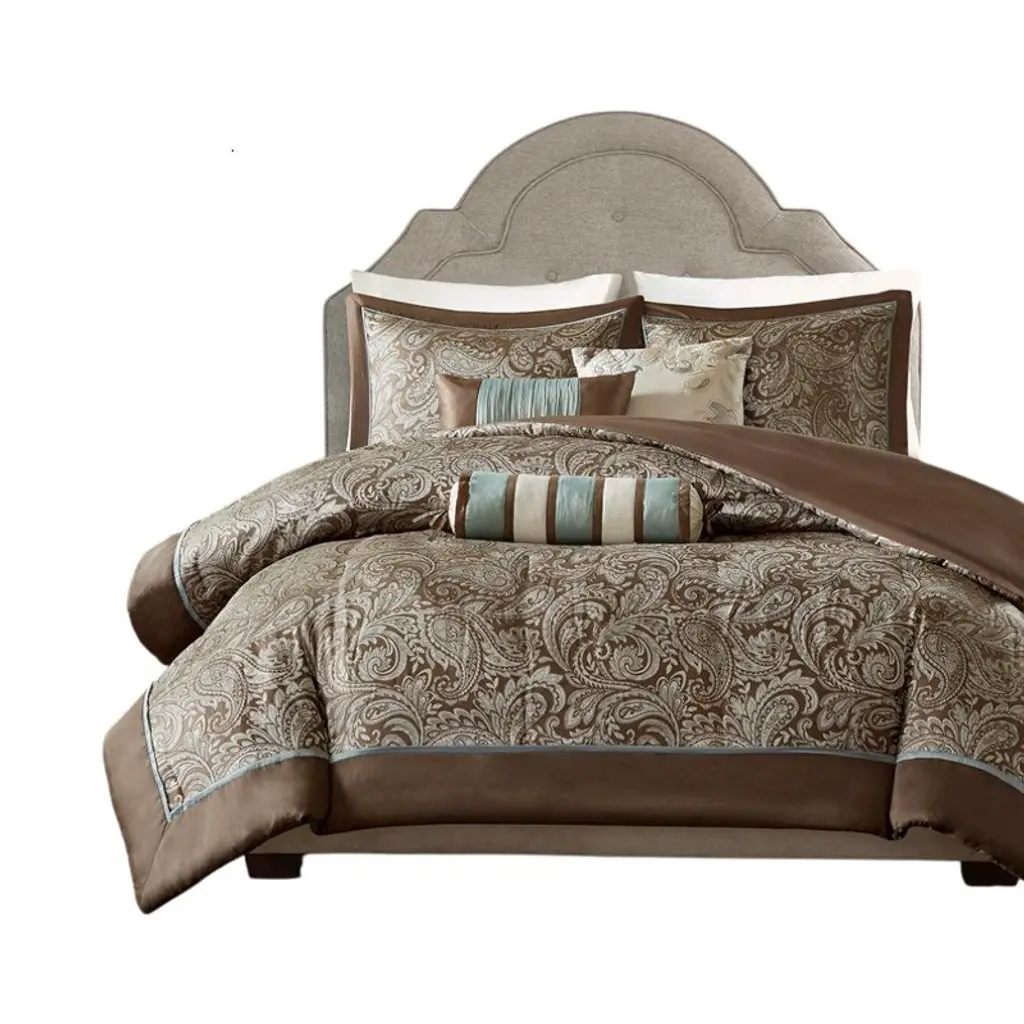 Elevate your bedroom with the 24-Piece Bedroom Set, offering a refined and traditional update to your decor. The pieced faux silk comforter, shams, and window valances are adorned with jacquard details in rich red and natural hues, delivering an elegant statement. The luxurious comforter features off-center large medallion embroidery, adding charm and dimension to the bedding set, while matching shams echo the motif, creating an elegant look in your space. Accompanying the set is a microfiber sheet set and bed skirt that complements the collection, offering exceptional comfort and style.The set is completed with two Euro shams and four decorative pillows, providing a finished look to the bedding. Additionally, the set contains four window panels with tie backs and two jacquard valances, adding the perfect finishing touches to your bedroom. This comprehensive bedding set is designed to create a luxurious and cohesive look in your space. Please note that this bedding set may come in rolled or compressed packing and will need to be fluffed up. Consider using a steam iron to help remove any wrinkles.