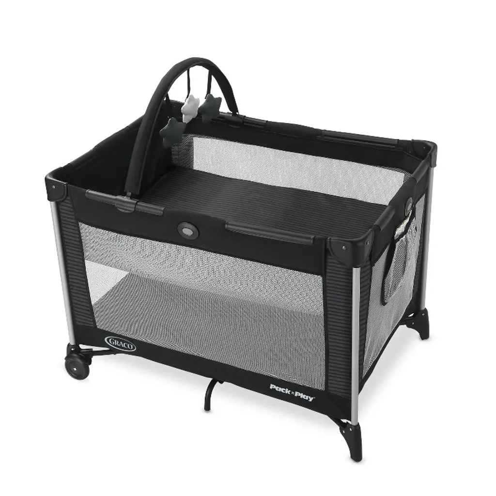 Keep your little one happy and comfortable no matter where you go with the Graco® Pack 'n Play® On the Go™ Playard. A removable full-size bassinet folds with the playard for a quick setup and fewer parts to carry. Folding feet and wheels allow for a compact fold, while the durable frame makes it perfectly suited for travel. The signature Graco push-button fold allows you to break it down quickly and hassle-free.