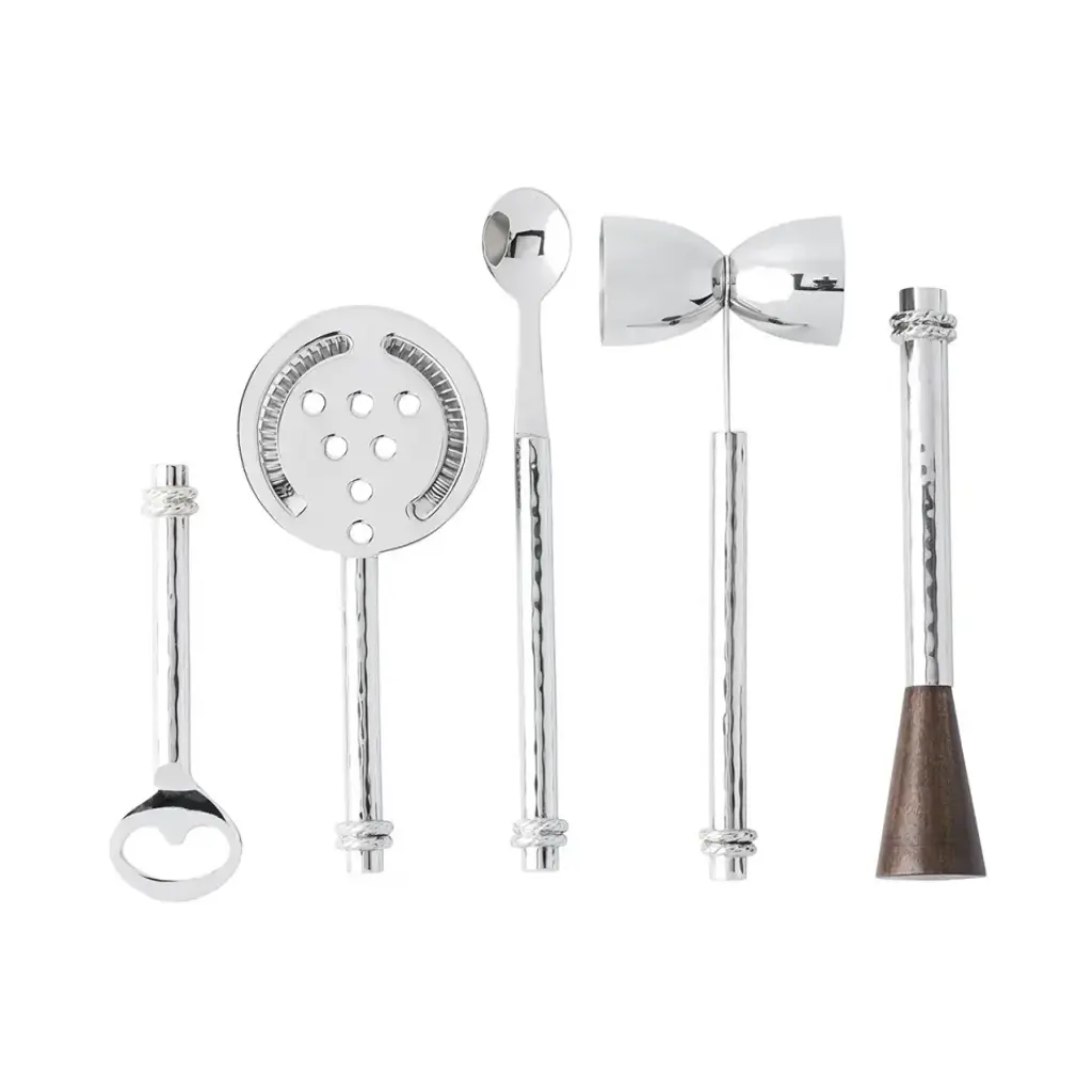 Hammered stainless steel bedecked with a tidy trimming of simple thread, this bar tool set is as handsome as it is supremely useful when crafting a cocktail, such as our favorite Monaco Mule! Set includes stand and five tools: double-sided jigger, cocktail strainer, bar spoon, bottle opener and muddler. Based in Connecticut, Juliska is committed to bringing elegant European design into our modern homes. Since its founding in 2001, when David and Capucine Gooding began by working with artisans outside of Prague to reproduce antique Bohemian glass pieces, every piece from Juliska has shared a rich heritage spanning six centuries of European design. Juliska's creations are timeless, romantic and effortlessly chic.
