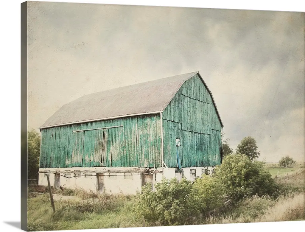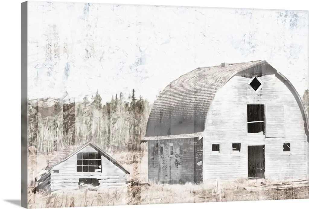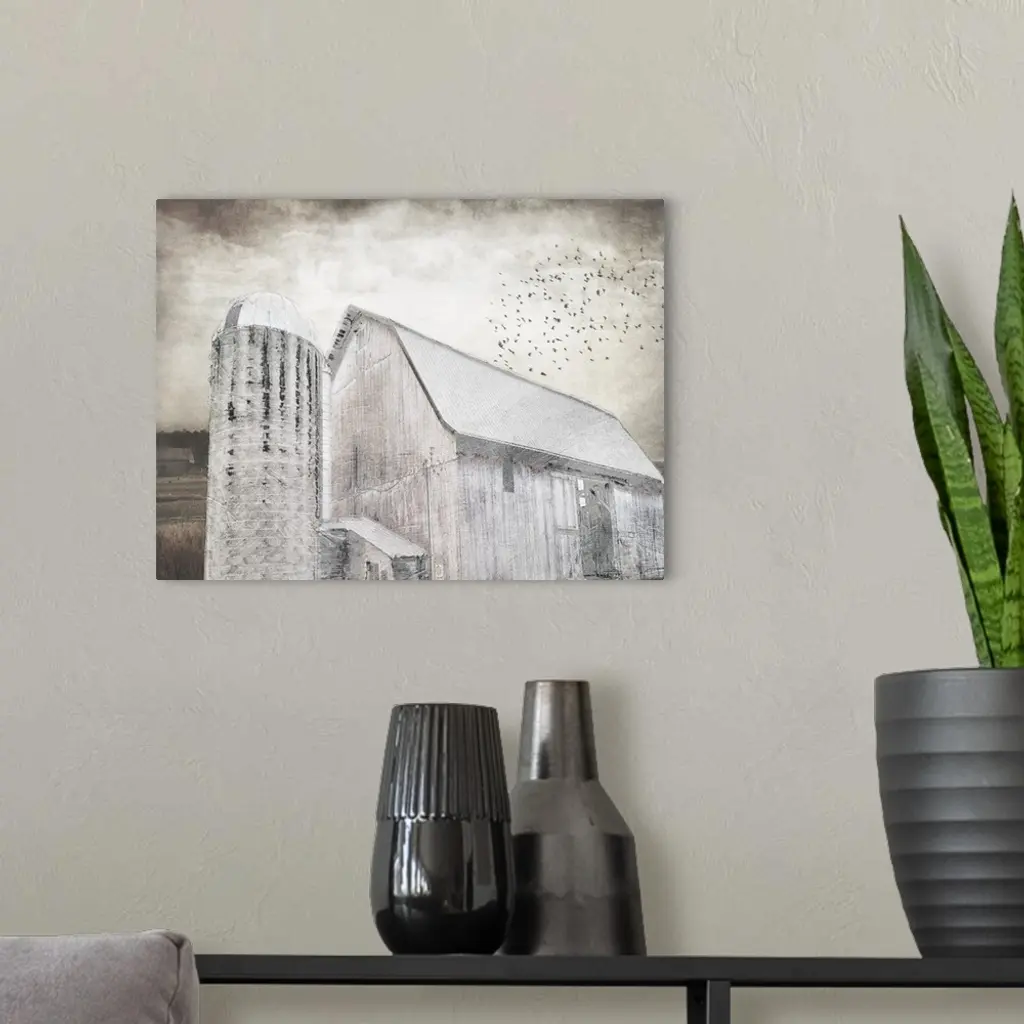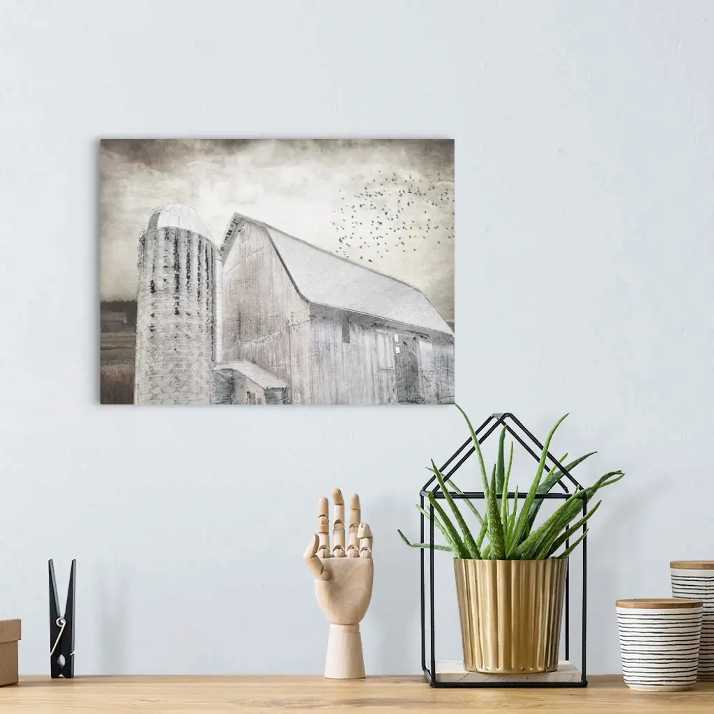 An image in shades of gray of a barn with a flock of birds above with a textured overlay.