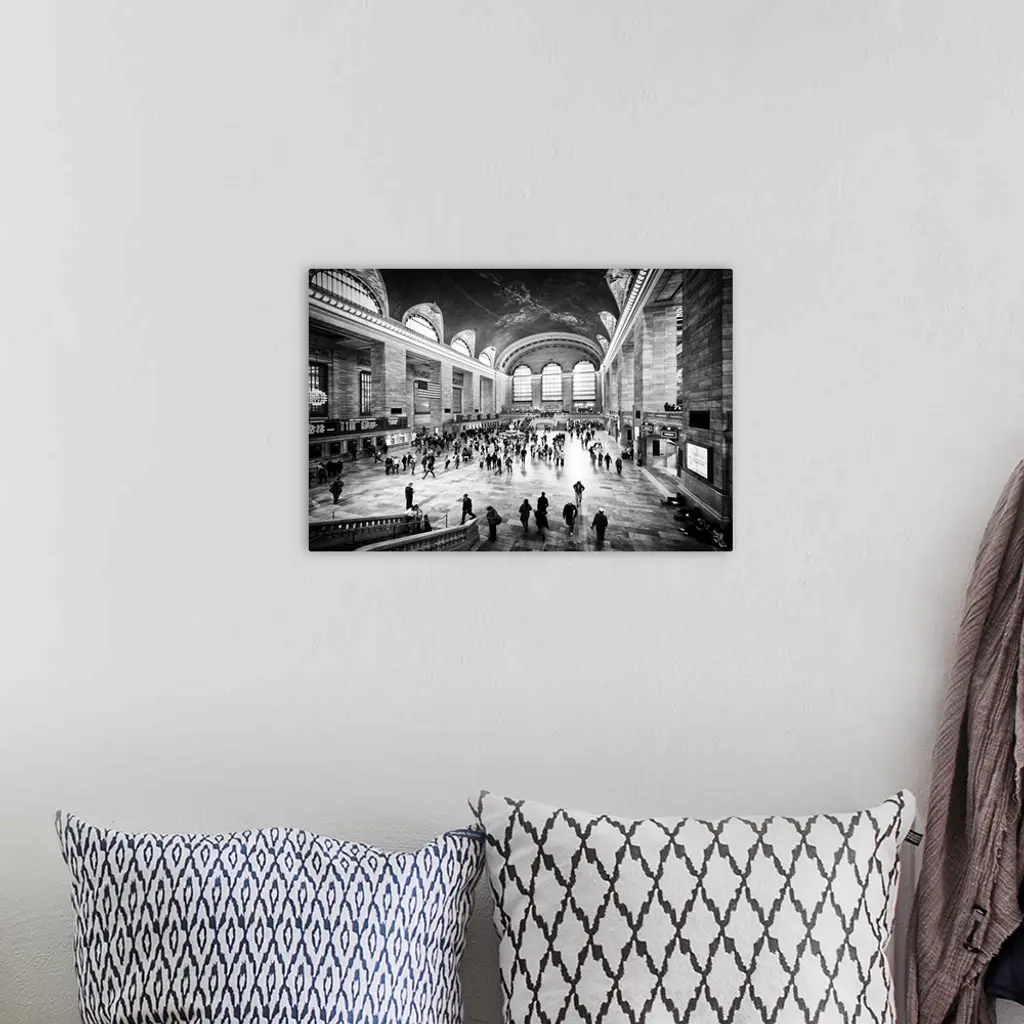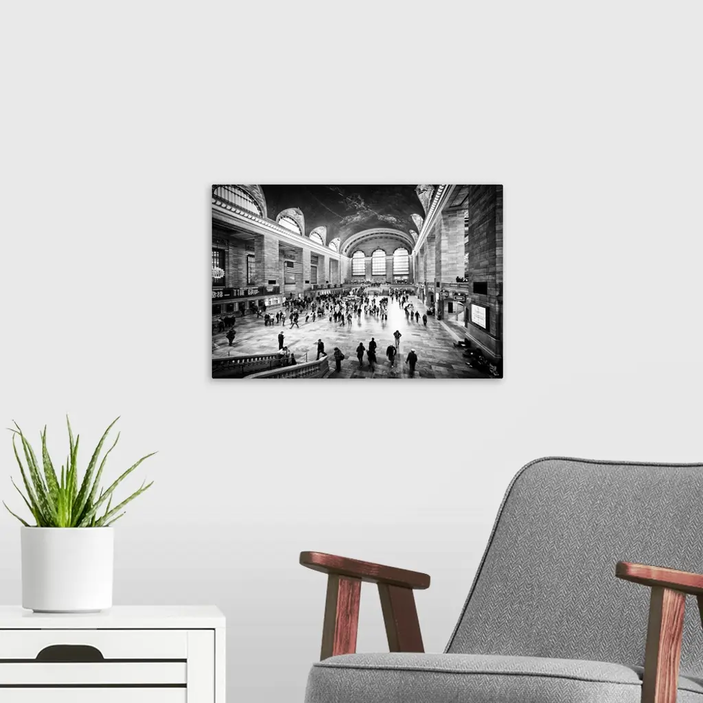 A black and white photograph of the interior of Grand Central Station in New York City.