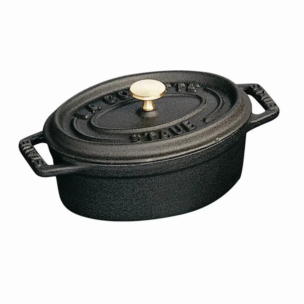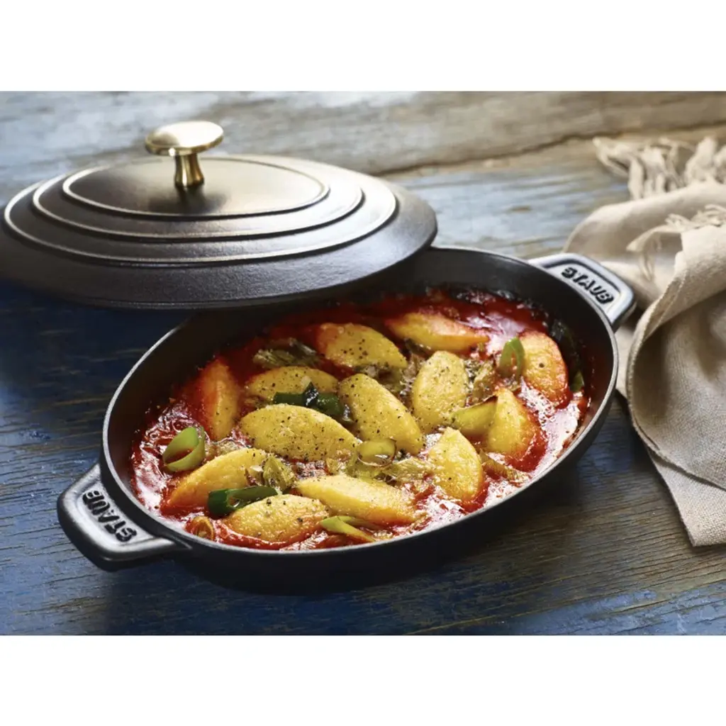 For centuries, cooks have taken advantage of the natural heat retention and redistribution properties of cast iron. Staub builds on this tradition with our enameled cast iron cookware. Black matte enamel inside and cooking surface creates a culinary advantage for better browning, braising, and roasting. Colorful enamel outside adds flare to your kitchen and table. Safe for use on all types of heat sources, including gas, electric, and induction, and oven safe up to 500F. Chip-resistant and dishwasher-safe.