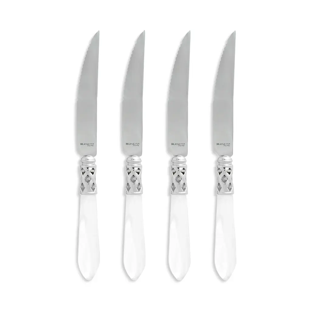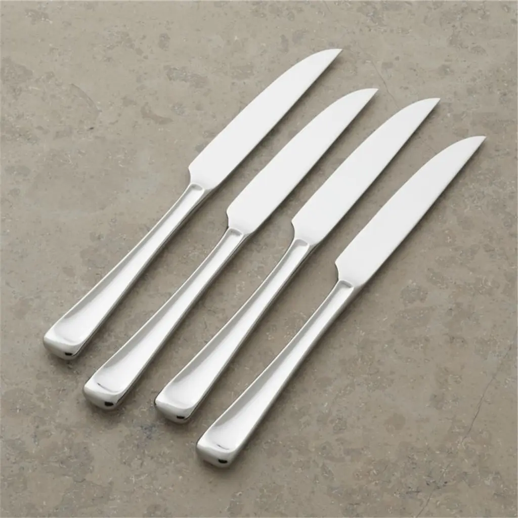 Contoured, serrated steak knives join our scaled-up, substantial Grand Hotel flatware. The classic design features intricate beadwork accentuated with a subtle dome in the center of the hollow handles. Reed & Barton and other Wedding Registry offers