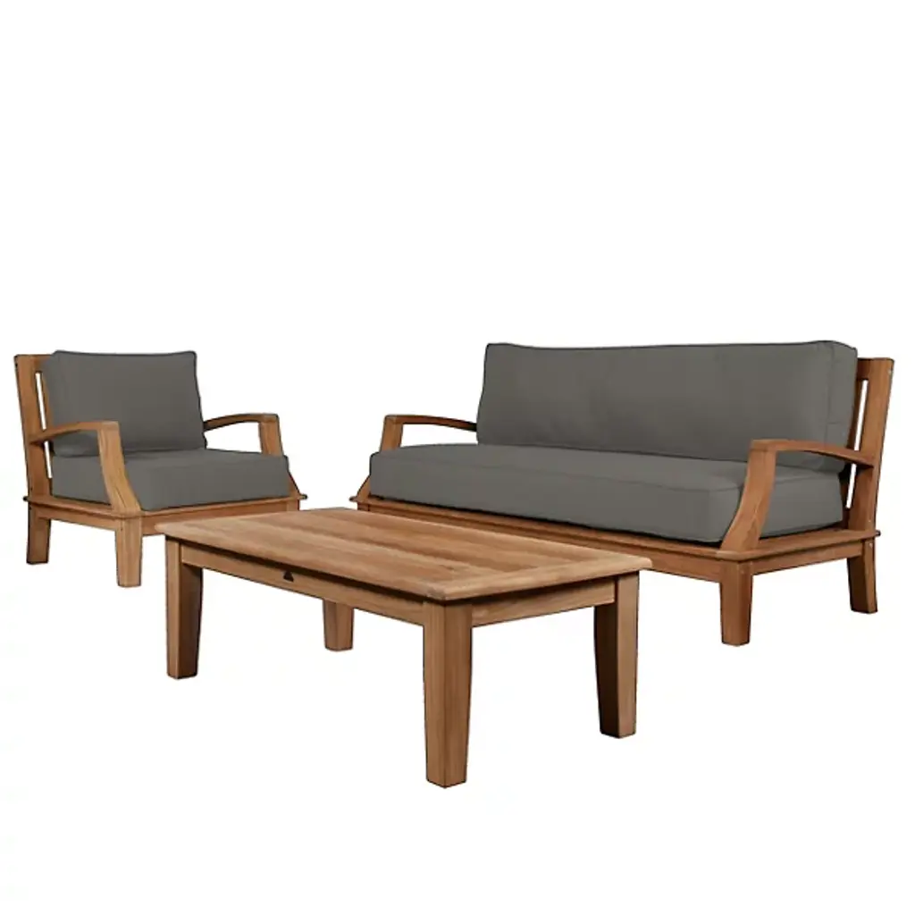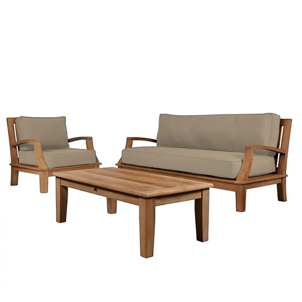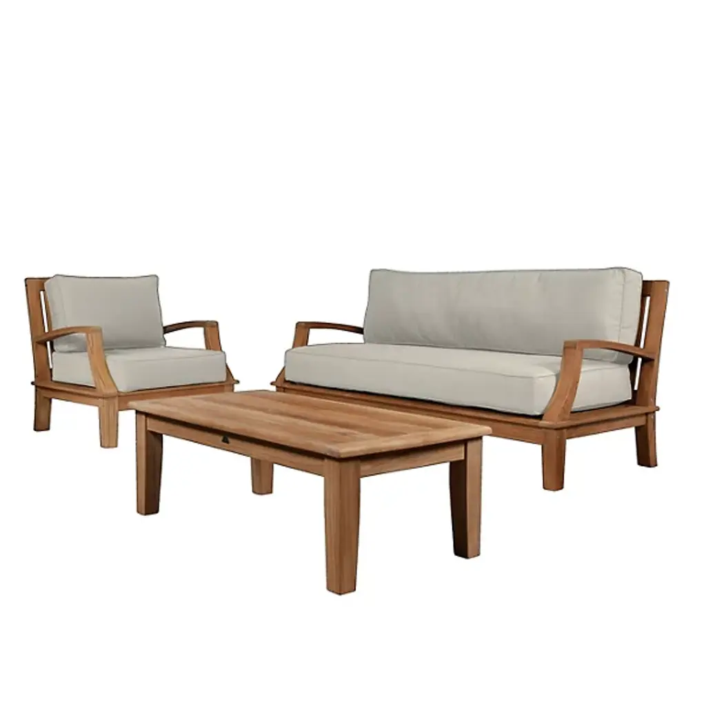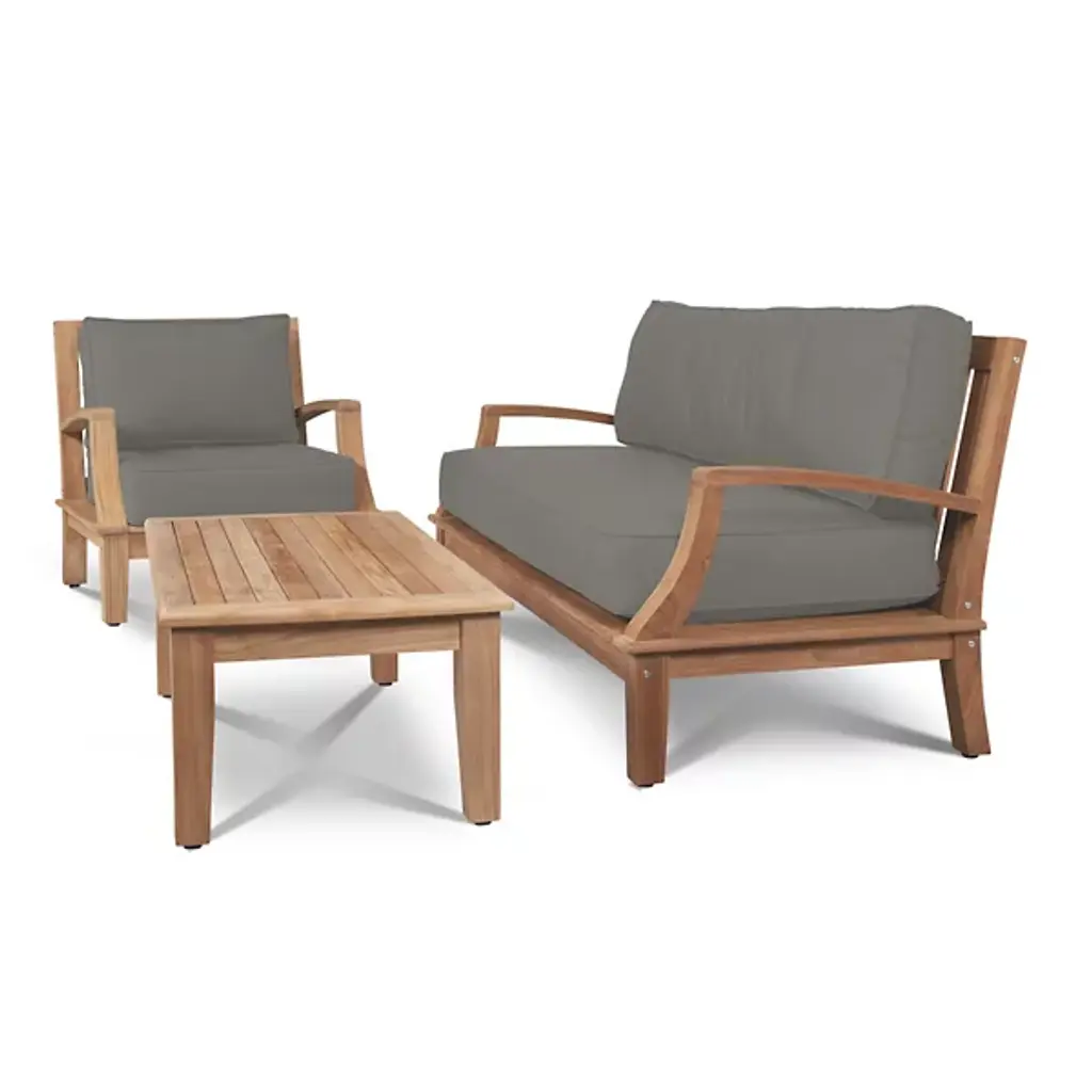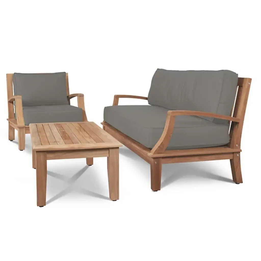 Presented by HiTeak Furniture, the Grande 4-Piece Teak Outdoor Patio Deep Seating Set features Sunbrella Cushions for all-weather durability. The premium teak is responsibly harvested and long-lasting, with superior construction throughout. It’s also highly desired for resistance to wear from weather, rot, and insects. The signature Sunbrella cushions are weather-resistant and made to order from dense foam. Hand-sanded to a light golden hue, if left untreated, it will age beautifully into a soft silvery grey.