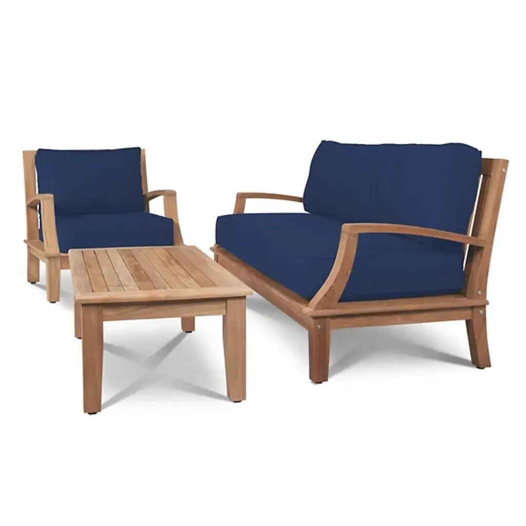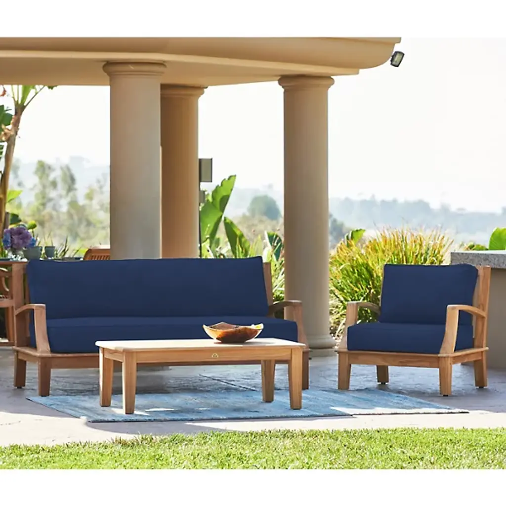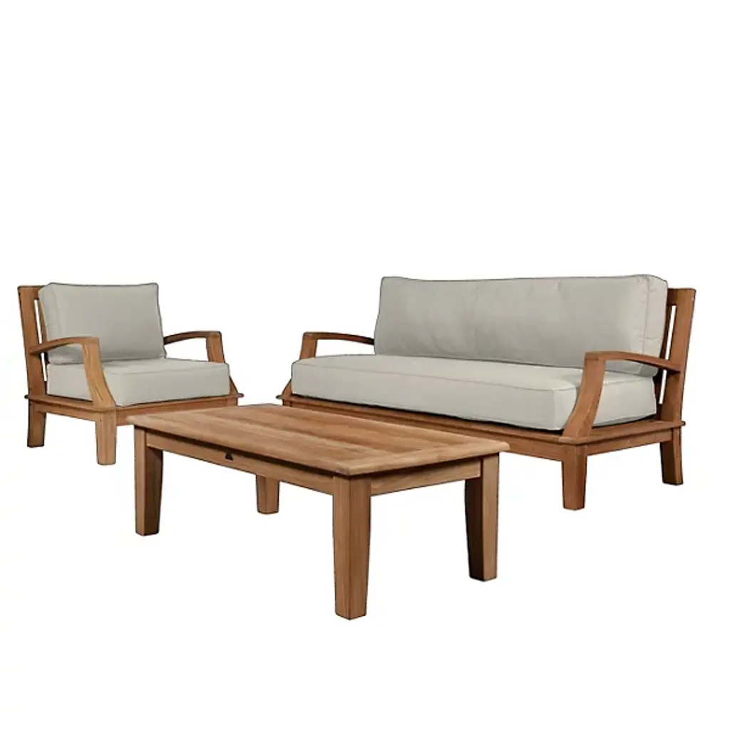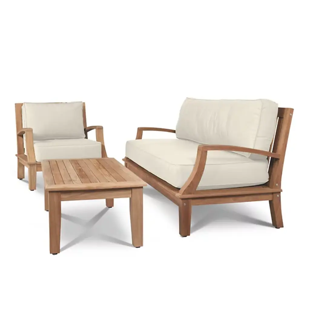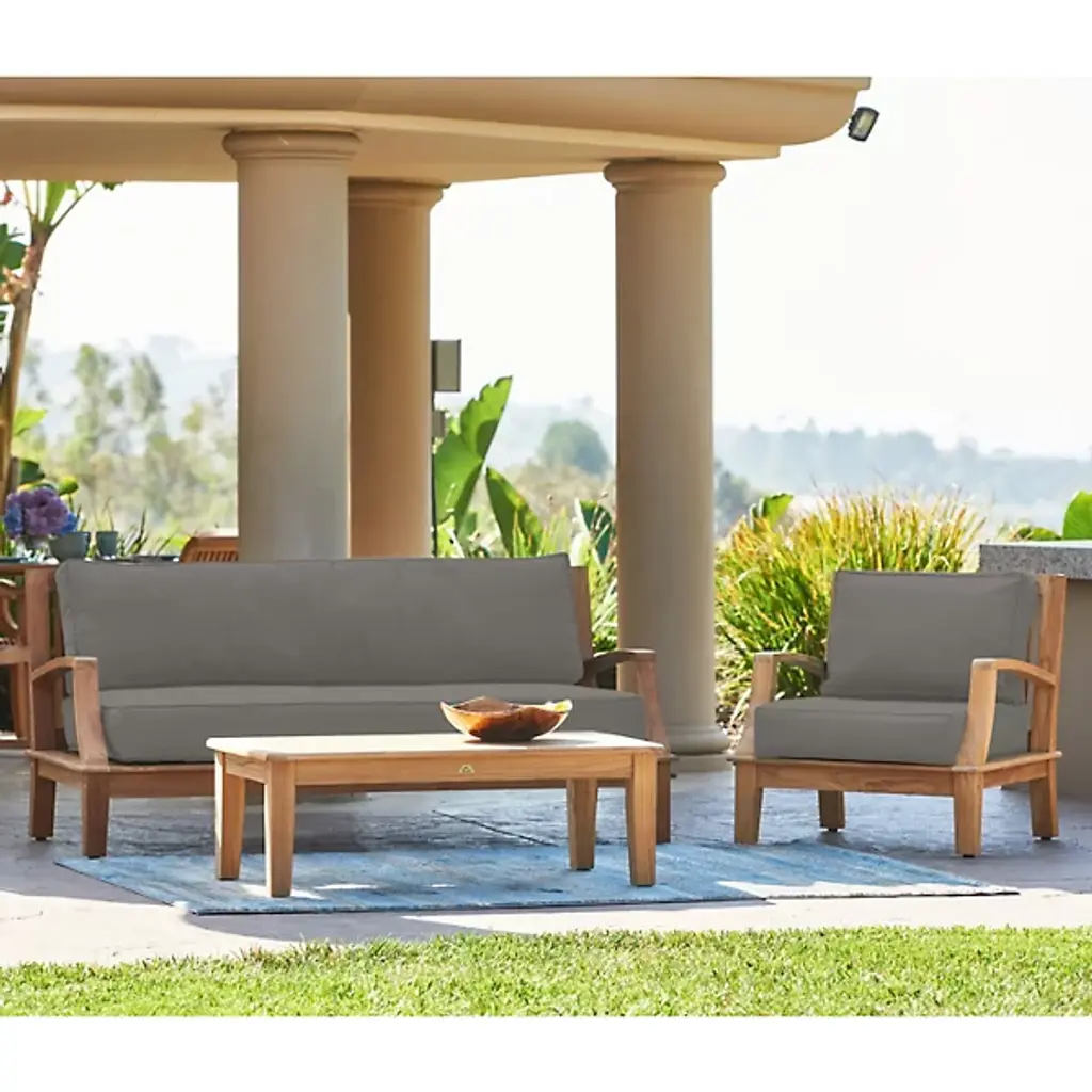 Presented by HiTeak Furniture, the Grande 4-Piece Teak Outdoor Patio Deep Seating Set features Sunbrella Cushions for all-weather durability. The premium teak is responsibly harvested and long-lasting, with superior construction throughout. It’s also highly desired for resistance to wear from weather, rot, and insects. The signature Sunbrella cushions are weather-resistant and made to order from dense foam. Hand-sanded to a light golden hue, if left untreated, it will age beautifully into a soft silvery grey.