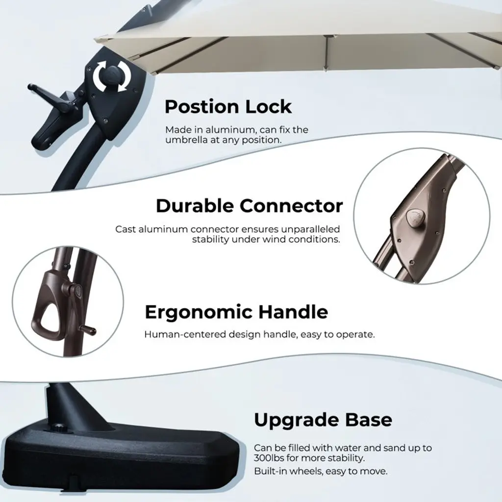 This cantilever umbrella offers a stylish and practical solution for shading your outdoor space. The square canopy is crafted from water-, fade-resistant polyester fabric, providing UPF 50 protection from the sun's harsh rays. Its black powder-coated aluminum pole and steel ribs ensure stability and support. The crank lift mechanism allows for easy opening, while the manual tilt feature lets you adjust the angle for optimal shade coverage. Included with the umbrella is a plastic stand with counterweights and wheels for easy mobility.