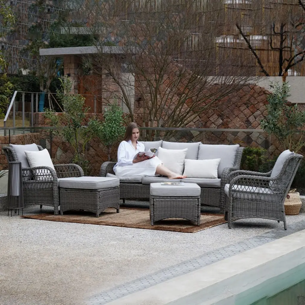 Wide armrests, convenient footstools, plush cushions and a high backrest create the ultimate relaxing outdoor experience. Enjoy with family and friends in the garden, on the porch, patio or deck.